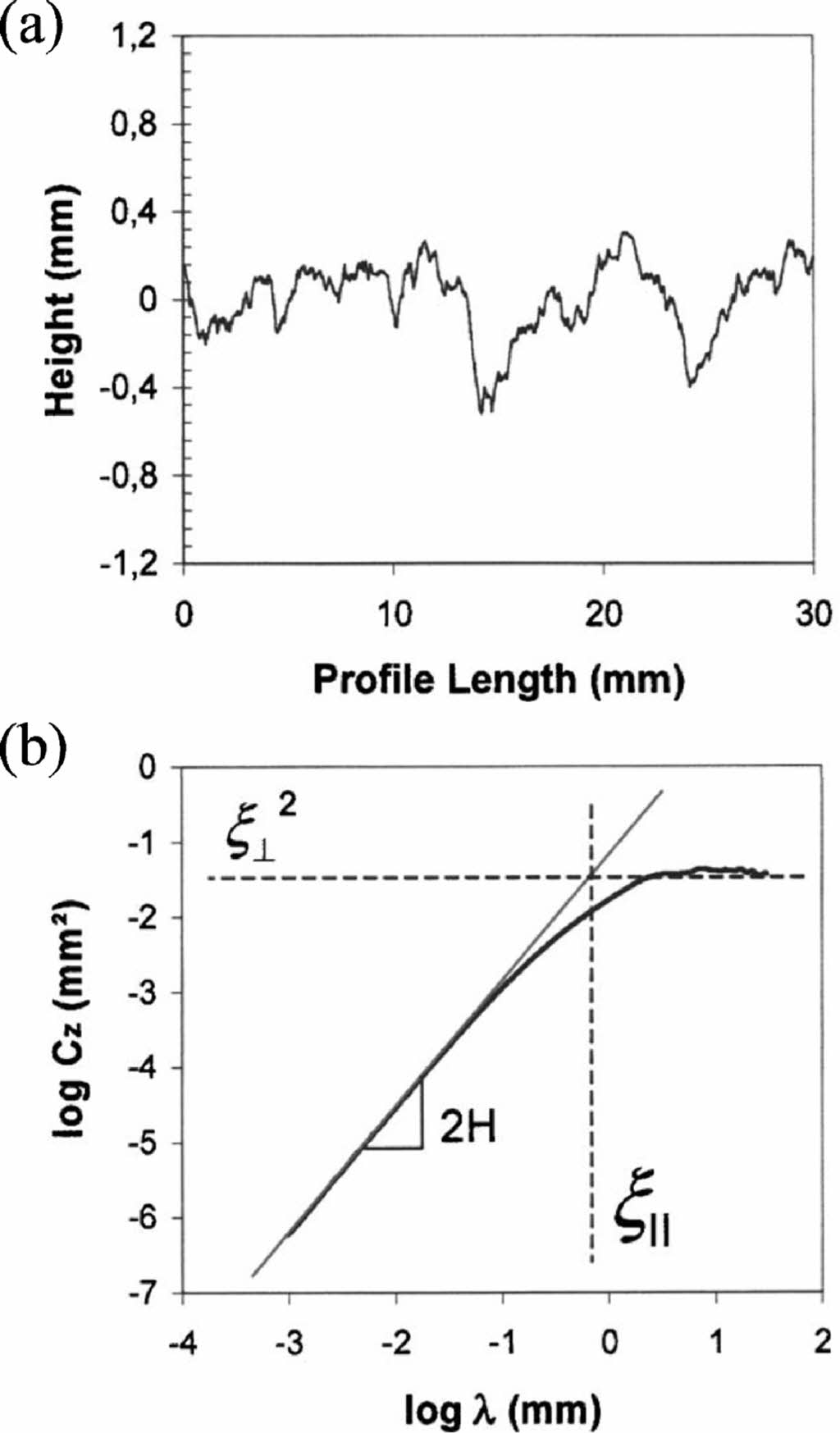 Fig. 2 (a) Stylus measurement of the profile and (b) corresponding height-difference correlation function of the granite surface [9] |