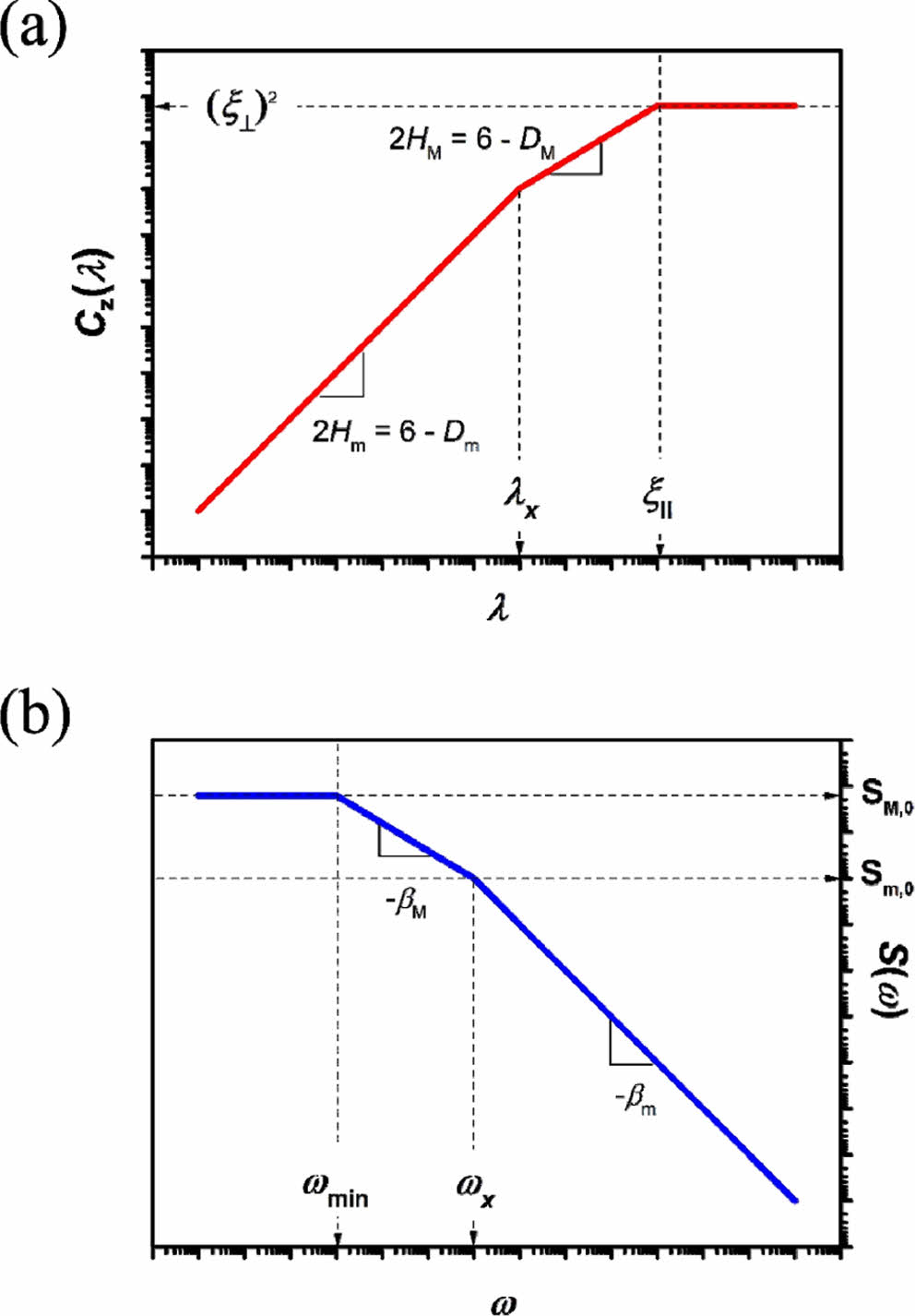 Fig. 3 (a) Height-difference correlation function with two scaling ranges and (b) corresponding power spectral density |