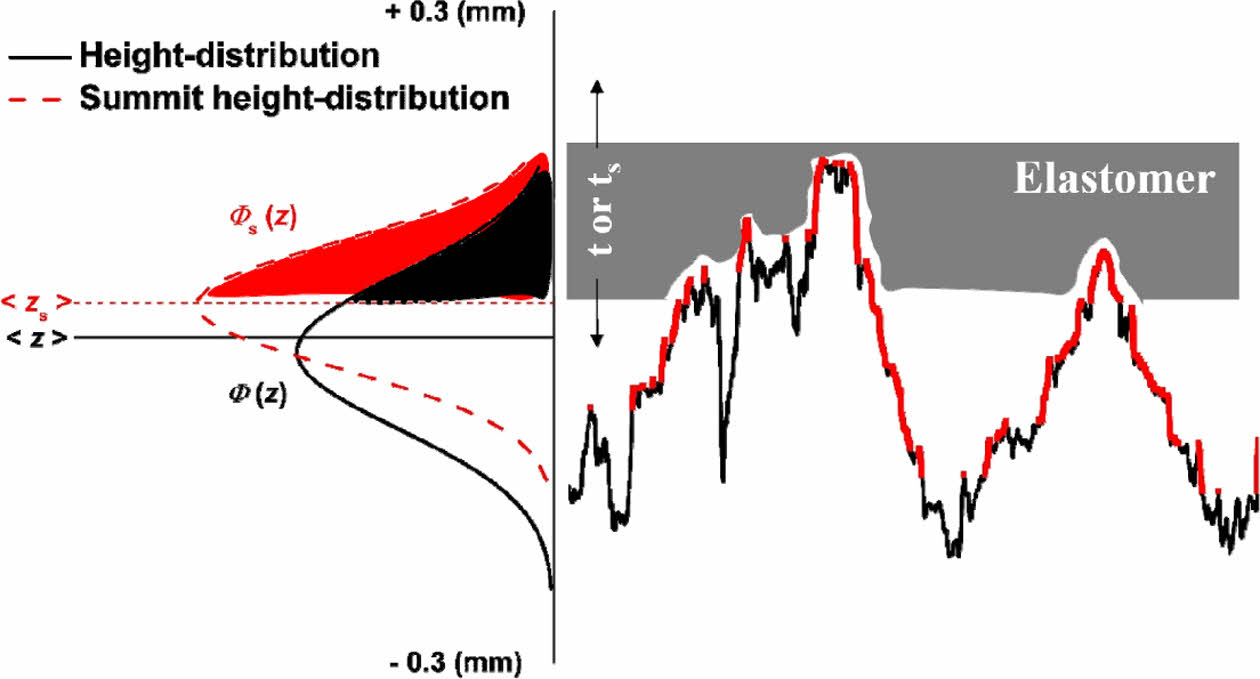 Fig. 4 Height- and summit height-distributions of a rough surface in contact with an elastomer |
