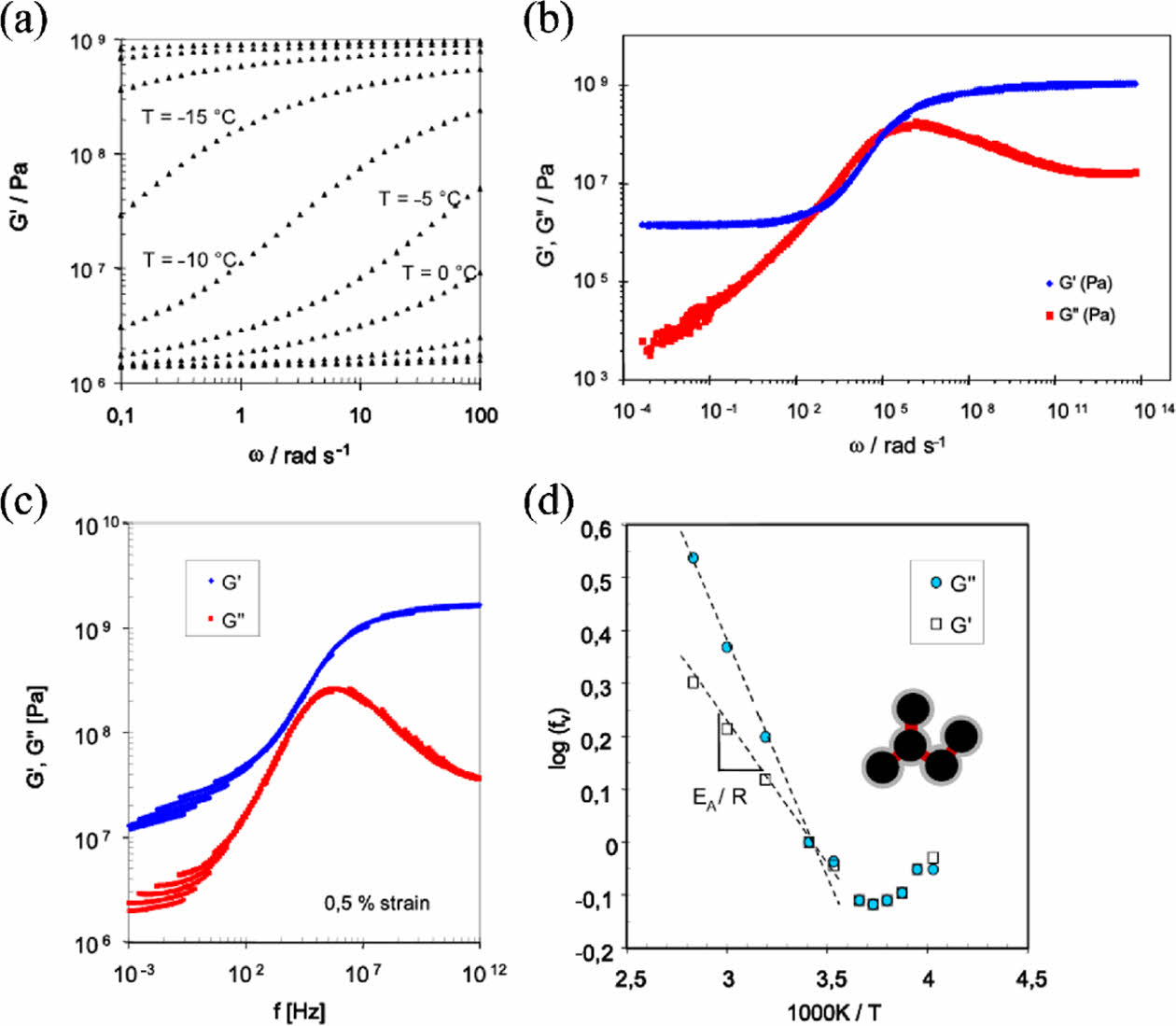 Fig. 6 (a) Storage modulus G' verses frequency at 0.5% strain of the unfilled S-SBR sample for various temperatures, (b) master curves of G' and G'' at T0=20o C after horizontal shifting, (c) discontinuous master curves of G' and G'' of the S-SBR sample with 60 phr N339 after horizontal shifting with shift factors from the unfilled sample, and (d) Arrhenius plot of the vertical shift factors, necessary to get continuous master curves of G' and G'' for the same sample. The inset illustrates part of the filler network with glassy-like polymer bridge [15] |