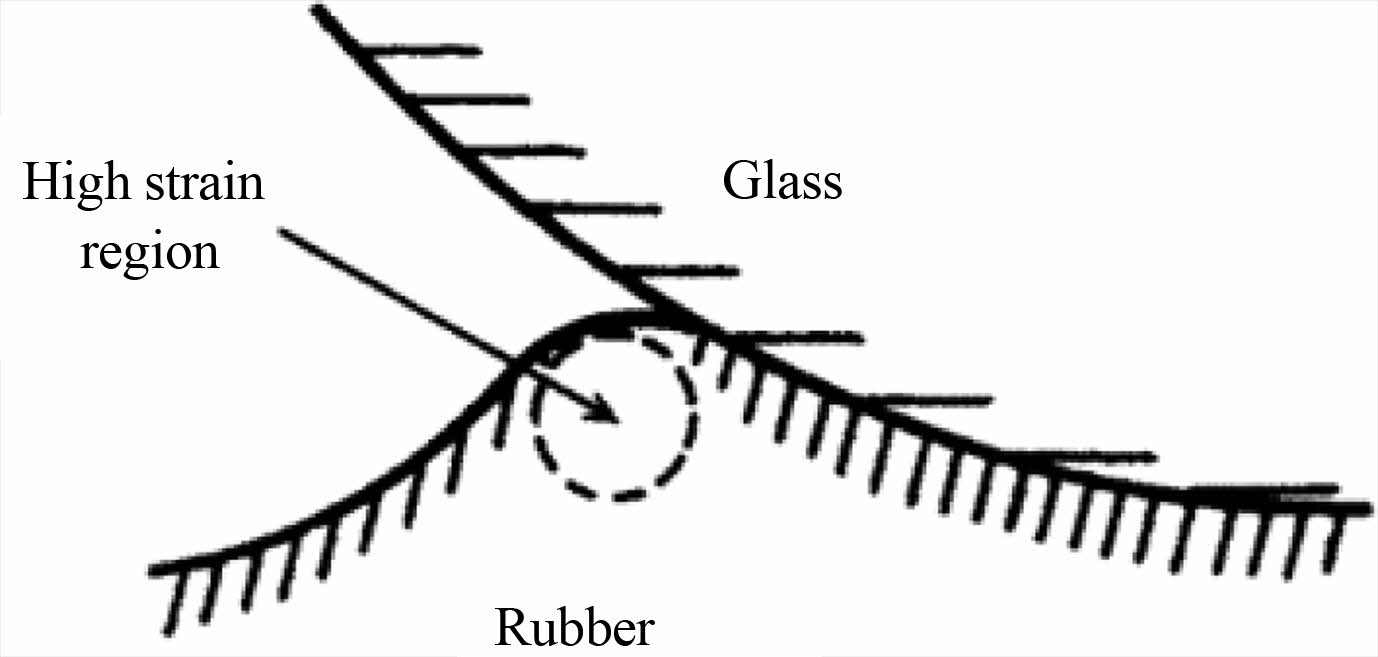 Fig. 7 Schematic representation of glass-rubber interface indicating likely region of high strain during the peeling apart of surfaces [21] |