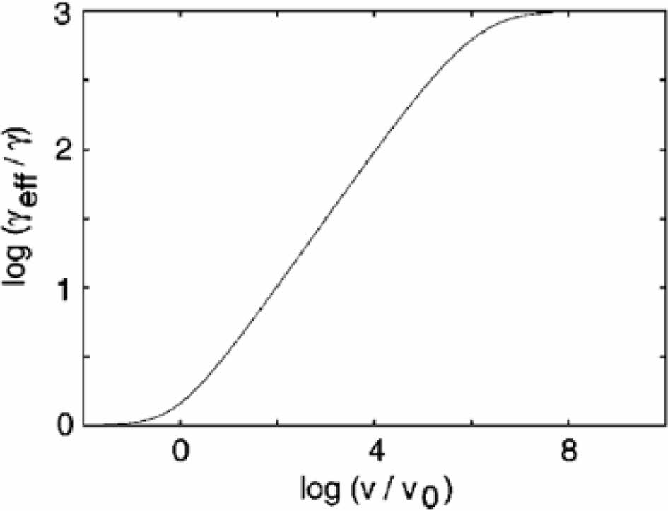 실접촉면적은 앞서 아핀-노면을 고려한 접촉 역학 모델(식 (22))을 적용하여 거친 노면 미끄러짐 시에 작용하는 점착 마찰을 예측할 수 있다. 점착 후 떨어지는 과정에 필요한 τs,0 값은 Δγ/ls와 같고 여기서 ls는 떨어짐 길이(peeling length) 즉, 해당 과정이 일어나는 길이를 의미한다. 이때 점착과 떨어짐 과정의 표면에너지는 유기탄성체 점탄성과 같이 그 속도에 의존하고 충분히 느린 속도에서는 정적 표면에너지 값 Δγ0에 도달하지만, 속도가 빨라짐에 따라 Fig. 8과 같이 지수법칙을 따르는 전이 구간을 보이게 된다[22]. 이러한 현상을 고려하여 Le Gal[9]은 식 (28)과 같은 경험식을 제시하였다.