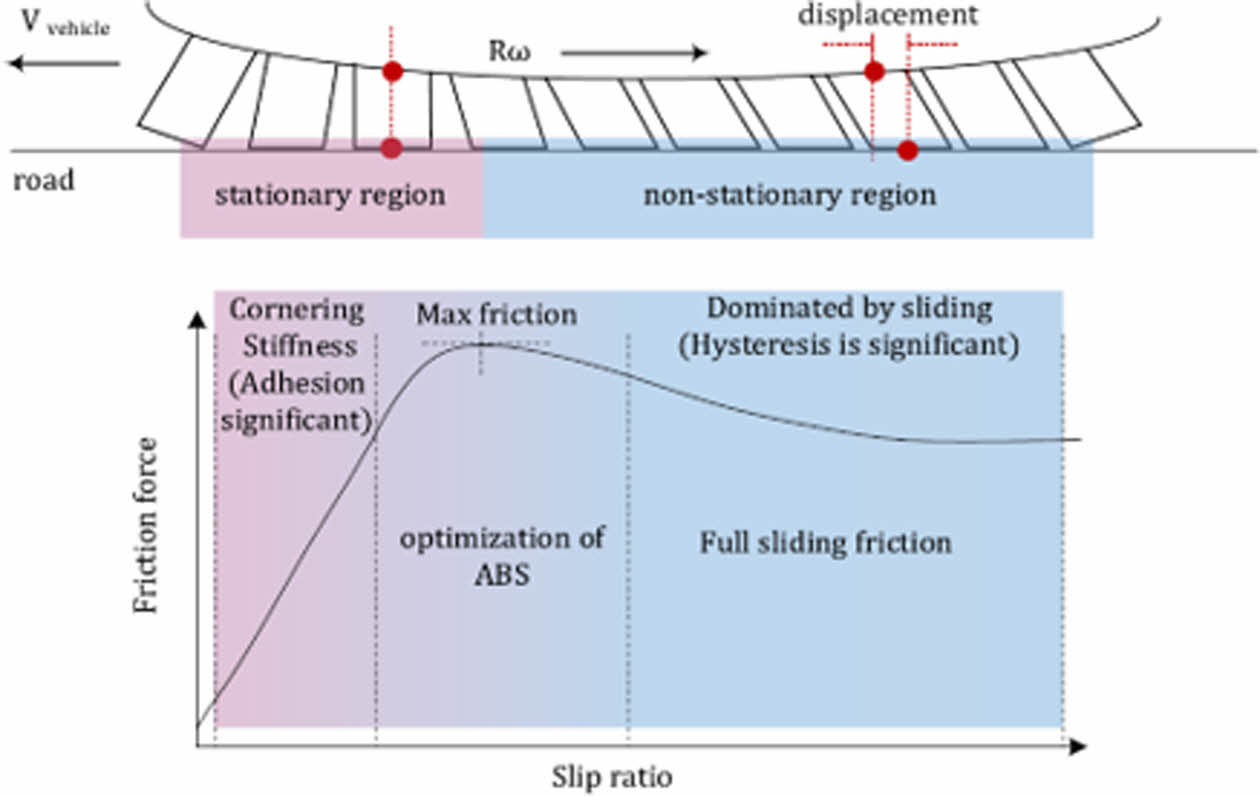 일반적인 아스팔트와 같은 거친 노면에서의 미끄러짐에 의한 유기탄성체 마찰은 기본적으로 노면 돌기에 의해 변형되어 소재 내부에서 손실되는 에너지인 히스테리시스(hysteresis)와 유기탄성체와 노면 간 접촉면적에서의 분자 간 인력으로 형성되는 점착(adhesion)에 의한 마찰력으로 구성된다. 따라서 노면이 매우 거칠거나 젖어 있는 경우에는 점착에 의한 마찰보다는 히스테리시스에 의한 마찰의 기여도가 증가하며 반대로 노면이 충분히 매끄러우면 히스테리시스 보다는 점착에 의한 마찰의 기여도가 증가하게 된다. 이와 같이 유기탄성체 마찰은 노면 상태 및 거칠기에 따라 크게 좌우되며 이는 결국 유기탄성체의 점탄성(viscoelasticity)과 연결되어 마찰 상대속도에 따른 점탄성 변화로부터의 마찰 거동을 이해해야 한다.