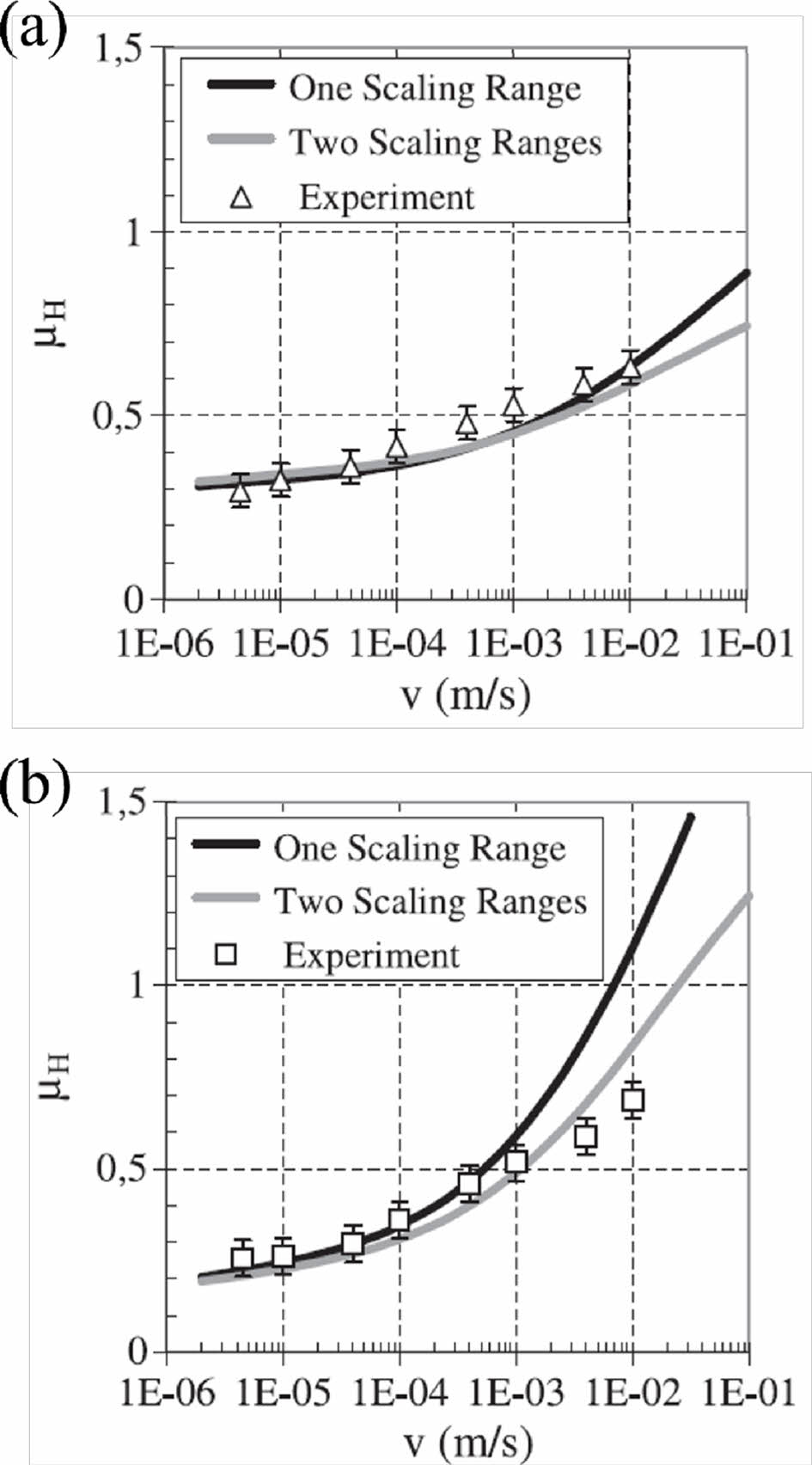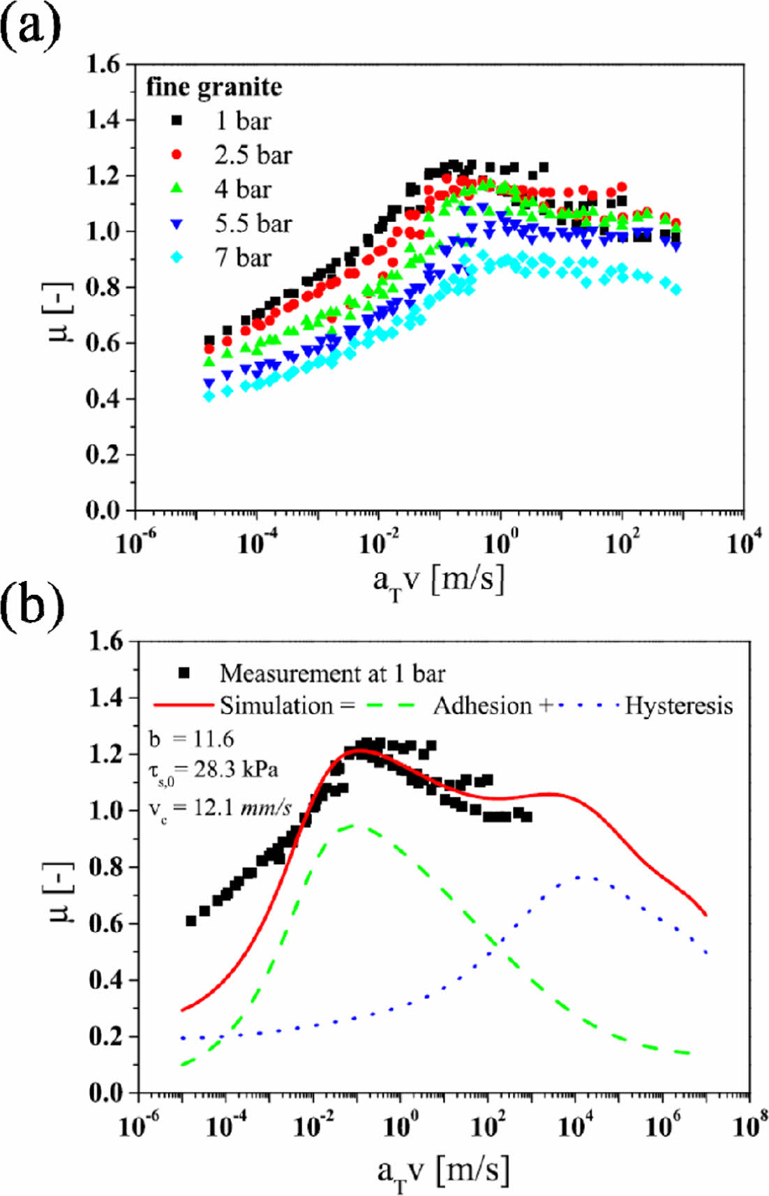 Fig. 12 (a) Friction master curves for fine granite at different load levels, as indicated. The reference temperature is 70oC. (b) Fitting of friction master curves for fine granite by the sum of adhesion and hysteresis contributions for 1 bar load [28] |
