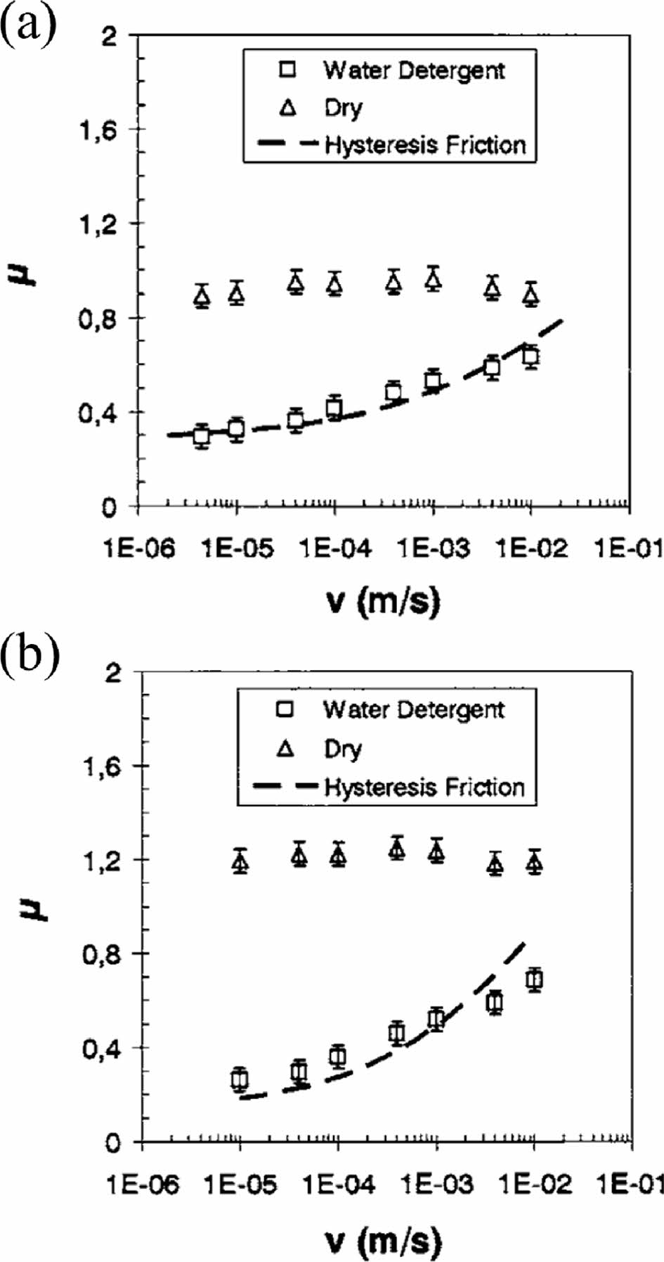 Fig. 13 Stationary friction curves (symbols) for (a) carbon blackand (b) silica-filled S-SBR samples on a granite surface at 12.3 kPa load under dry and wet conditions, as indicated [9] |
