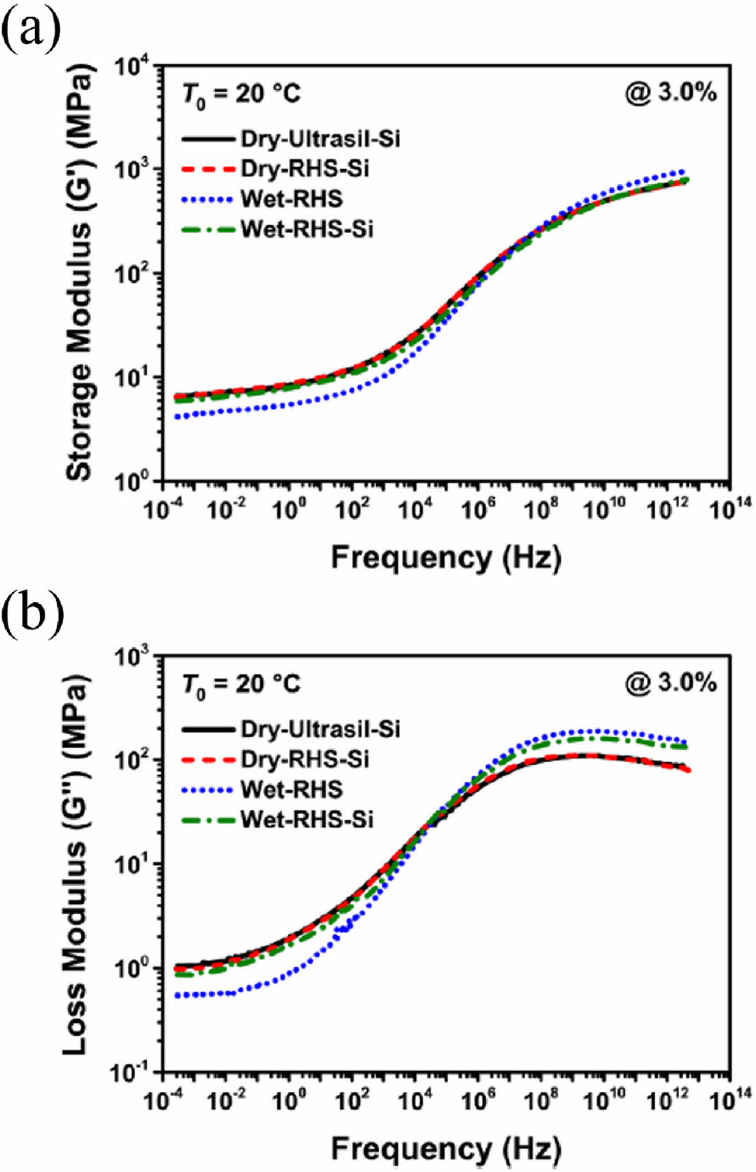 마지막으로 Yoon[29]은 왕겨 실리카(rice husk silica)가 보강된 트레드 컴파운드의 제조 방법에 따른 점탄성 변화와 이로 인해 달라지는 마찰 거동을 실험 결과와 Klüppel & Heinrich 마찰 이론을 접목하여 설명하였다. 먼저 기존 실리카와 왕겨 실리카의 점탄성 영향에 대한 차이는 거의 없었고 제조 방법이 고상의 유기탄성체와 배합제들을 컴파운딩하는 dry 컴파운딩인지 혹은 유기탄성체 라텍스(latex)에 필러를 먼저 분산시킨 후 컴파운딩하는 wet 컴파운딩인지에 따라 점탄성 마스터커브가 달라짐을 실험적으로 확인했다(Fig. 15).