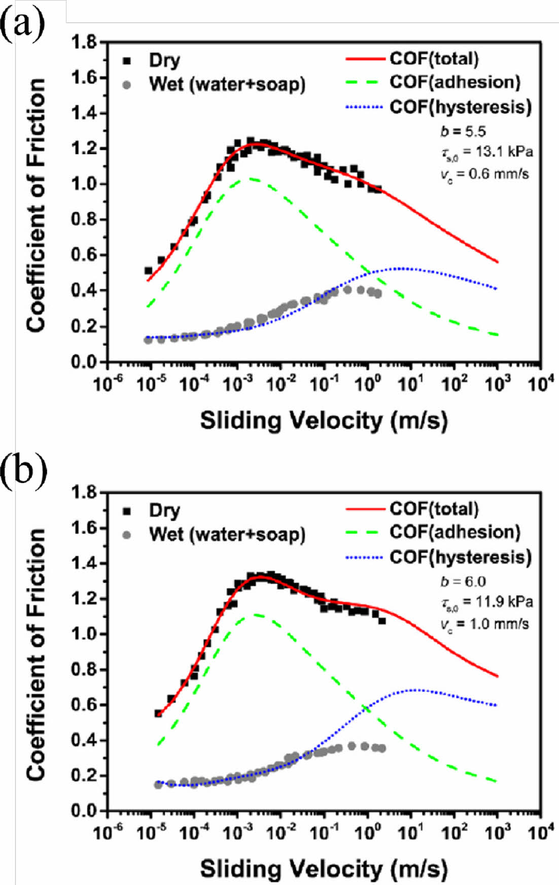 Fig. 16 Dry and wet friction master curves with friction model fitting curves by the sum of adhesion and hysteresis contributions for (a) Dry-RHS-Si and (b) Wet-RHS-Si composites [29] |