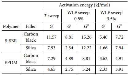 Table 1 Comparison of the activation energy values obtained at 0.5% and 3.5% strains for the differently filled composites. The results from frequency sweeps of G' and G'', indicated as WLF sweeps, and the directly estimated activation energies of G' from temperature sweeps are shown [9] |