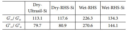 구체적으로 wet 컴파운딩으로 제조된 복합재료 시편(Wet-RHS-Si)의 경우 dry 컴파운딩으로 제조된 복합재료 시편(Dry-RHS-Si) 대비 G∞/Go 값이 G'과 G" 모두에서 더 큰 값을 나타내었다(Table 2).