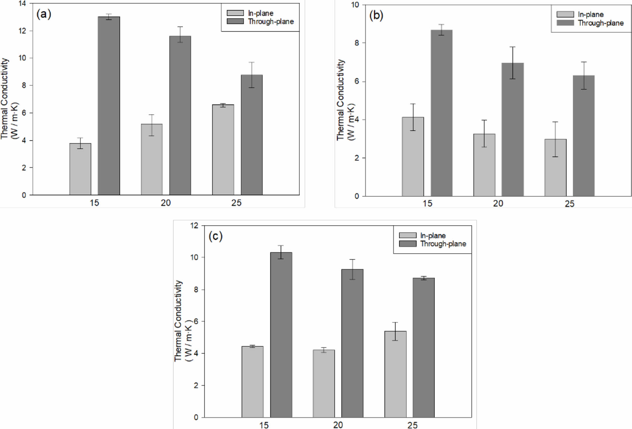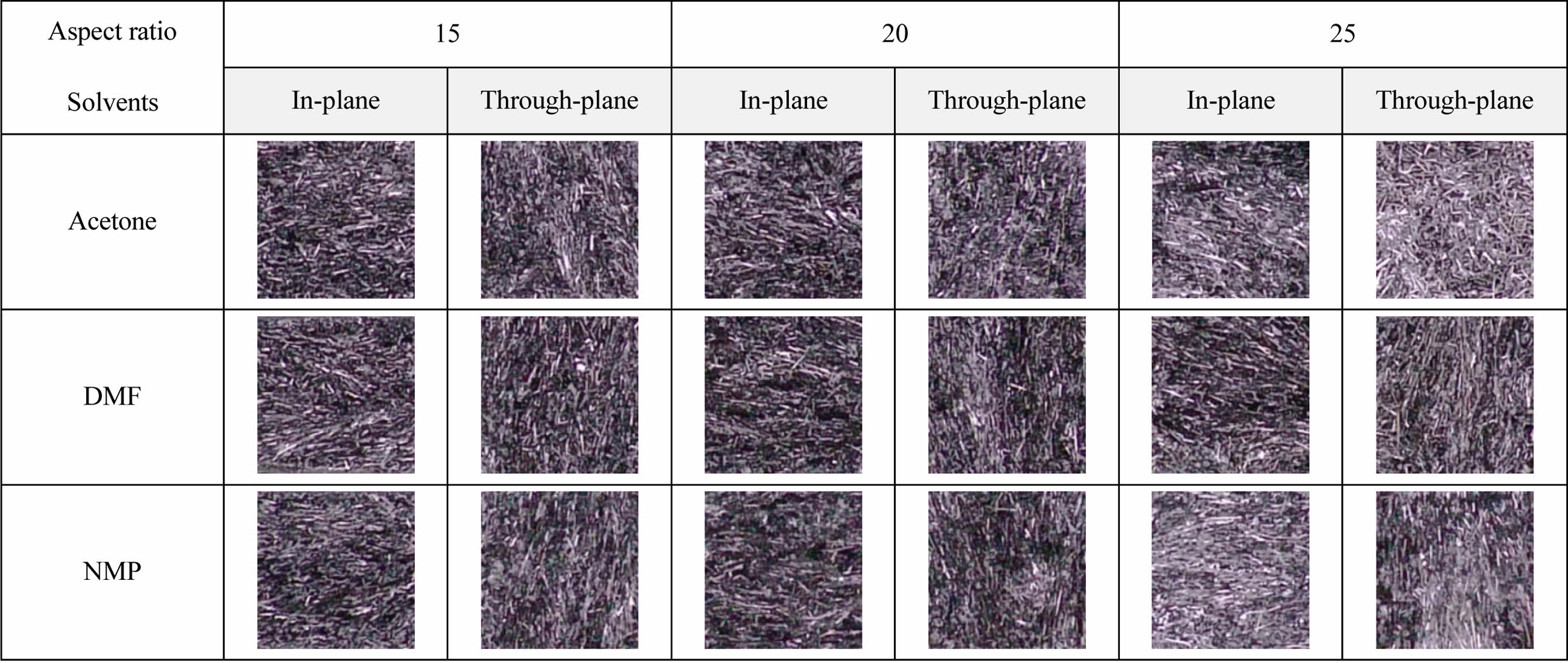 각 시편에 대해 열전도도를 측정한 결과를 Fig. 3와 Table 2, 3에 나타내었다. Through-plane 방향에서 세 가지 solvent에 대해 모두 Aspect ratio가 낮을수록 높은 열전도도를 보였으며 Acetone, NMP, DMF 순으로 높은 값을 보였다. Through-plane의 경우 aspect ratio가 25인 시편의 열전도도를 기준으로 했을 때 aspect ratio가 15인 시편의 열전도도는 순서대로 48.39%, 37.80%, 18.42%의 향상된 수치를 보였다. 이러한 결과를 통해 solvent와 fiber의 aspect ratio가 배열에 영향을 주는 것이라고 판단할 수 있다. Table 1의 결과에서 볼 수 있듯이 각 solvent 별 점도의 차이가 있을 뿐 아니라 각 aspect ratio 별로 각기 suspension 유체의 점도가 다른 것을 볼 수 있다. 즉 높은 aspect ratio의 fiber에서 상대적으로 높은 점도 값을 갖는 suspension 유체 환경이 만들어졌으며 높은 점도 suspension 유체 환경에서 성형 시 상대적으로 낮은 배열성이 부여되는 것을 열전도도 측정 결과를 통해서도 확인할 수 있었다.