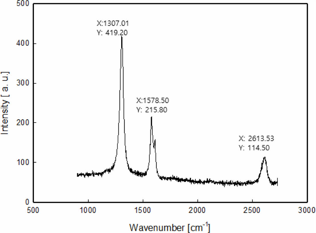 Raman 분광법은 분자구조에 관한 정보를 비파괴 실험을 통해 알수 있는 방법이다. 514.5 nm의 빛을 x 50 과악 렌즈를 통해 샘플에 입사시키고 후방으로 산란된 라만 신호를 모아 냉각된 고체 촬상 소자(charged coupled device)로 라만 신호를 검출하여 결과를 얻었다. Fig. 3은 GNP의 라만 스펙트럼 결과를 보여준다. 결함에 의해 나타난 1307 cm-1 부근의 D-peak와 1578 cm-1에 위치한 탄소의 sp2 결합에 의한 G-peak, 2613 cm-1 부근에 나타난 이중산란 의한 2D-peak를 볼 수 있다[13-15]. 화학기상증착법(CVD)로 제조된 GNP는 결함으로 인해 D peak가 매우 높게 관찰되는 것을 볼 수 있다 [13,16].