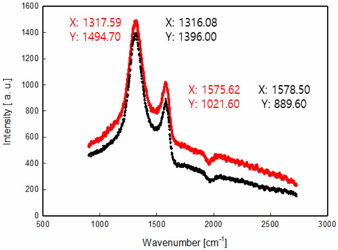 Fig. 4에서는 GO와 R-GO의 라만 스펙트럼 결과를 볼 수 있는데 검정색 라인 스펙트럼은 GO이고 빨간색 스펙트럼은 R-GO의 라만 분석 결과이다. 둘 다 그래핀 특유의 1340 cm-1 부근의 D-peak와 1580 cm-1 G-peak가 관찰되었다. 그래핀 결정 내의 결함에 의한 D-peak와 흑연계 물질에서 공통적으로 발견되는 G-peak를 통해 6각형 구조의 탄소원자들이 인접한 원자와 서로 반대로 진동하는 모드를 보여주는 것으로 볼 수 있다[17,18]. 하지만 2D-peak는 관찰되지 않았다. GO, R-GO의 경우 D-peak와 G-peak의 강도는 GNP에 비해 증가하였고 R-GO의 경우 GO에 비해 D-peak와 G-peak의 강도가 감소하는 것을 볼 수 있었다. Peak 강도를 정량적으로 분석하기 위해 ID/IG 비를 통해 알아보았는데 GO의 경우 ID/IG이 1.07의 값을 나타내었고 R-GO는 1.15 값을 보여 약 0.08 정도 증가함을 확인할 수 있었고 이는 기존의 여러 결과들과 유사한 결과를 보여주는 것을 확인할 수 있었다[19].