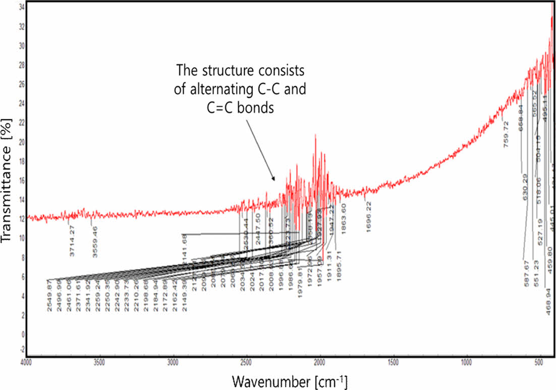 각 재료의 작용기 확인을 위해 FTIR 분석을 진행하였고 Fig. 5에서는 GNP의 결과를 보여준다. GNP의 경우 특정한 peak 특징을 보여주지 못한 채 1696~1863 cm-1 부근에서 C=O peak 및 1979~2034 cm-1에서의 C-C, C=C peak를 확인할 수 있다. 이는 광범위한 파장 범위에서 C-C, C=C가 번갈아가며 연결된 구조라는 것을 보여준다.
