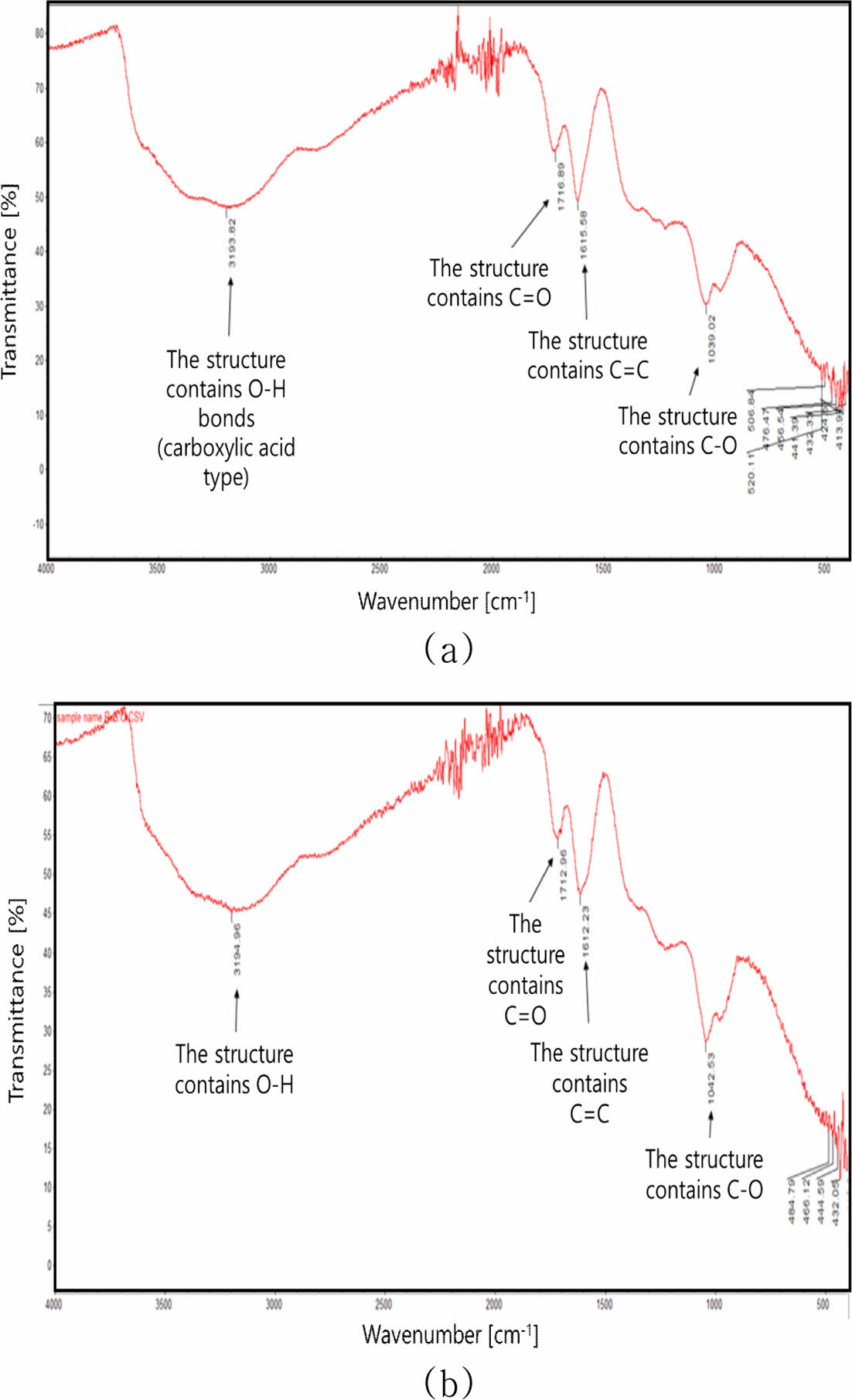 Fig. 6에서는 GO 및 R-GO의 결과를 보여준다. GNP와는 다르게 명확한 peak가 나타나는데 1040 cm-1 부근에서의 C-O 결합, 1615 cm-1 부근에서의 C=C 결합, 1715 cm-1 부근에서의 C=O 결합과 3193 cm-1 부근에서의 O-H 결합을 보여준다. 이것은 GO에 산소 분자들이 성공적으로 반응하는 물성을 보여준다. R-GO는 다소 peak가 작아지는 것을 확인할수 있다. GO, R-GO는 상호간 미세한 차이만 보였을 뿐 대부분 흡수대가 일치한 계열임을 확인할 수 있었다.