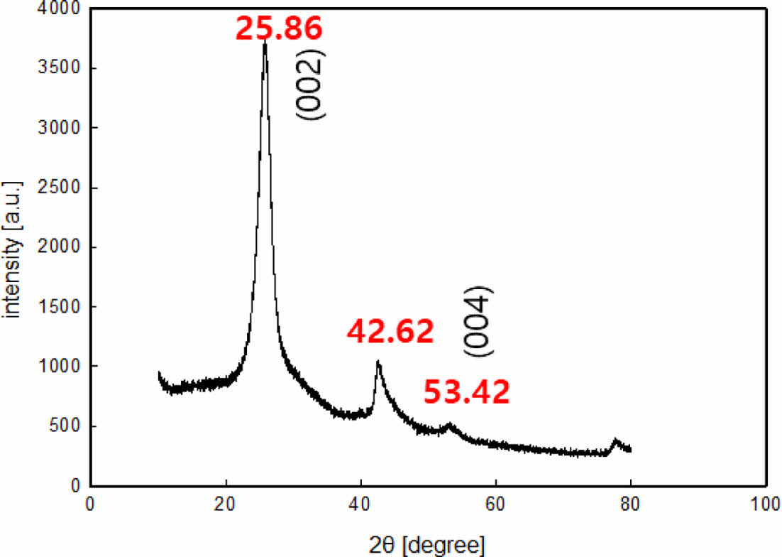 각 재료의 결정성 분석을 진행하기 위해 X-ray 회절 분석을 진행하였고 GNP의 XRD 결과를 Fig. 7에서 보여준다. 2θ=25. 86°, 42.62°, 53.42°에서 각 peak를 관찰할 수 있었는데 (002) 평면에 해당하는 25. 86°에서 넓은 회절을 나타내는 peak가 지배적인 것을 볼 수 있다. 또한 2θ가 약 26°의 peak 치는 Bragg’s law에 의해 층간 거리라 약 0.336 nm라는 것을 보여준다[20].