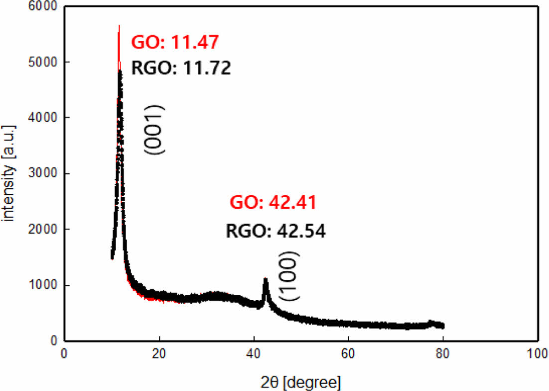 Fig. 8에서 볼 수 있듯이 GO의 경우 (001) 평면에 해당하는 11.47°에 해당하는 결정 peak와 (100) 평면을 나타내는 42.62°의 peak가 나타남을 확인할 수 있었다. 이는 무정형의 상이 나타남을 보여주는 GO의 특성과 일치하는 결과이다[21]. 또한 약 2θ=10°의 결과를 통해 0.884 nm의 층간거리가 나타남을 볼 수 있다. GO의 층간거리는 GNP에 비해 약 2.6배 증가한 것을 볼 수 있다. R-GO의 특징 또한 GO와 유사하게 (001) 평면에 해당하는 11.72°(100) 평면을 나타내는 42.54°의 peak 결과를 보여준다. R-GO의 경우 GO에 비해 다소 줄어든 intensity를 보였고 peak를 보이는 2θ 값이 약간 shift 한 것을 볼 수 있었다.