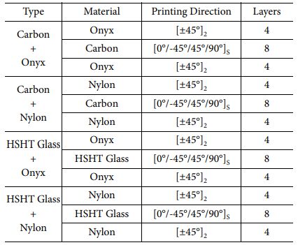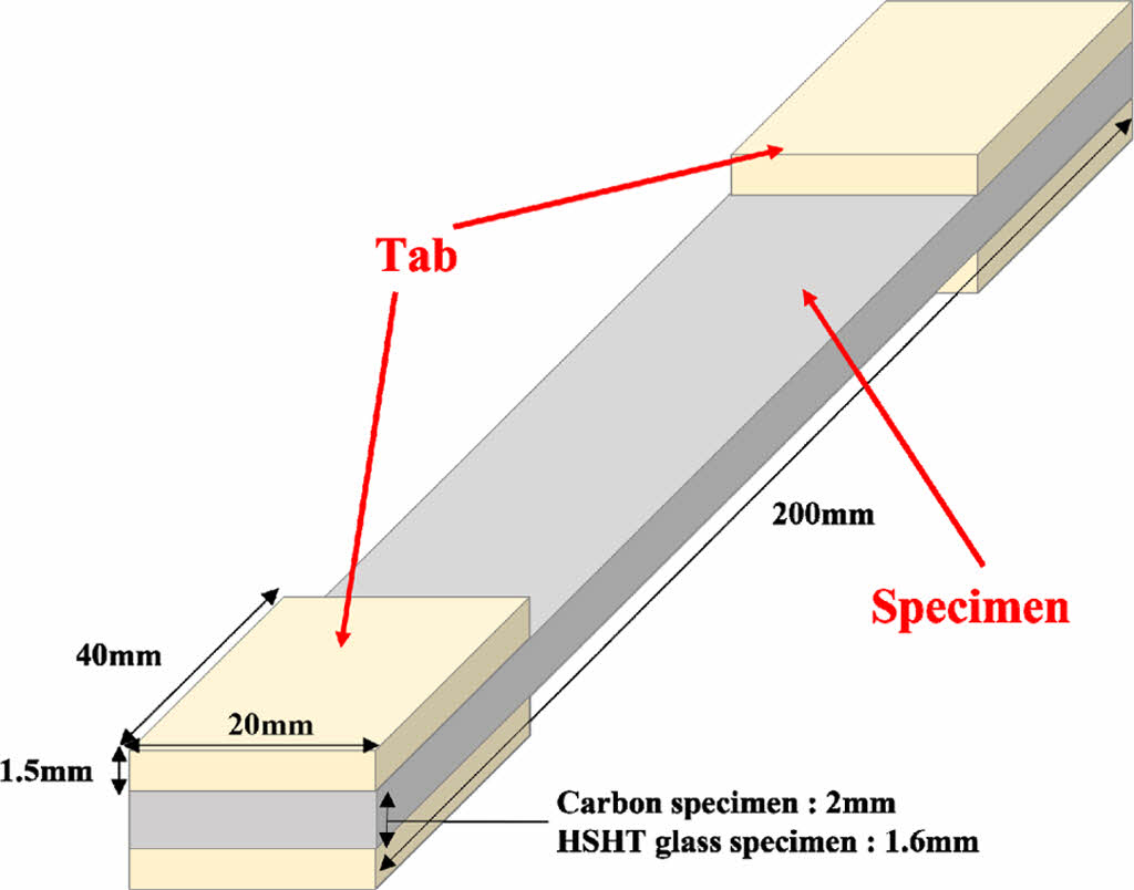 3D 프린트 복합재료 시편은 ASTM D3039[11]를 준용하여 제작하였다. 시편 제작을 위해 사용된 3D 프린터는 Markforged사의 Mark Two를 이용하였다. 시편 제작을 위해 사용된 기본 복합재료의 종류는 오닉스(onyx)와 나일론(nylon) 두 종류이며 연속 섬유는 탄소섬유 필라멘트(carbon fiber filament)와 고강도고온 유리섬유 필라멘트(HSHT fiberglass filament) 두 종류이다. 필라멘트의 프린팅 방향은 Table 1과 같이 다양한 방향에서 일관된 인장 특성을 보이는 준등방성 적층을 하였다[12]. 시편의 치수는 Fig. 2와 같으며 전체 길이는 200 mm, 폭은 20 mm이다. 연속 섬유에 따라 사용하는 노즐의 직경이 달라지므로 동일한 적층을 갖는 시편의 두께는 연속 섬유에 따라 달라진다. 탄소 섬유 필라멘트를 사용하는 경우 0.125 mm씩 적층되며, 고강도고온 유리섬유를 사용하는 경우 0.1 mm씩 적층된다. 따라서 시편의 총 두께는 탄소섬유 시편의 경우 2.0 mm, 고강도고온 시편의 경우 1.6 mm이다. 탭의 길이는 40 mm, 두께는 1.5 mm이다.Fig. 1