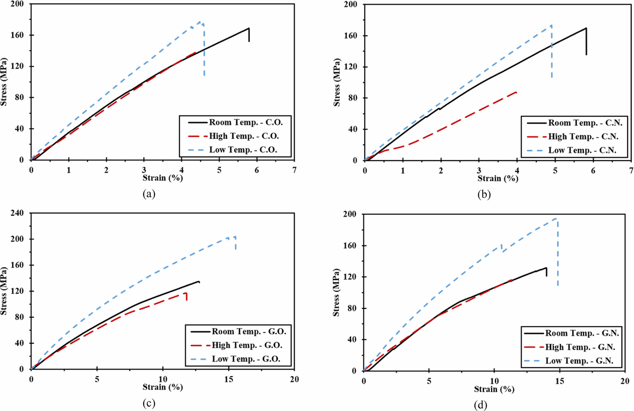 Fig. 3 Stress-Strain Curve by specimen type: (a) C.O. (Carbon + Onyx), (b) C.N. (Carbon + Nylon), (c) G.O. (HSHT glass + Onyx), (d) G.N. (HSHT glass + Nylon) |