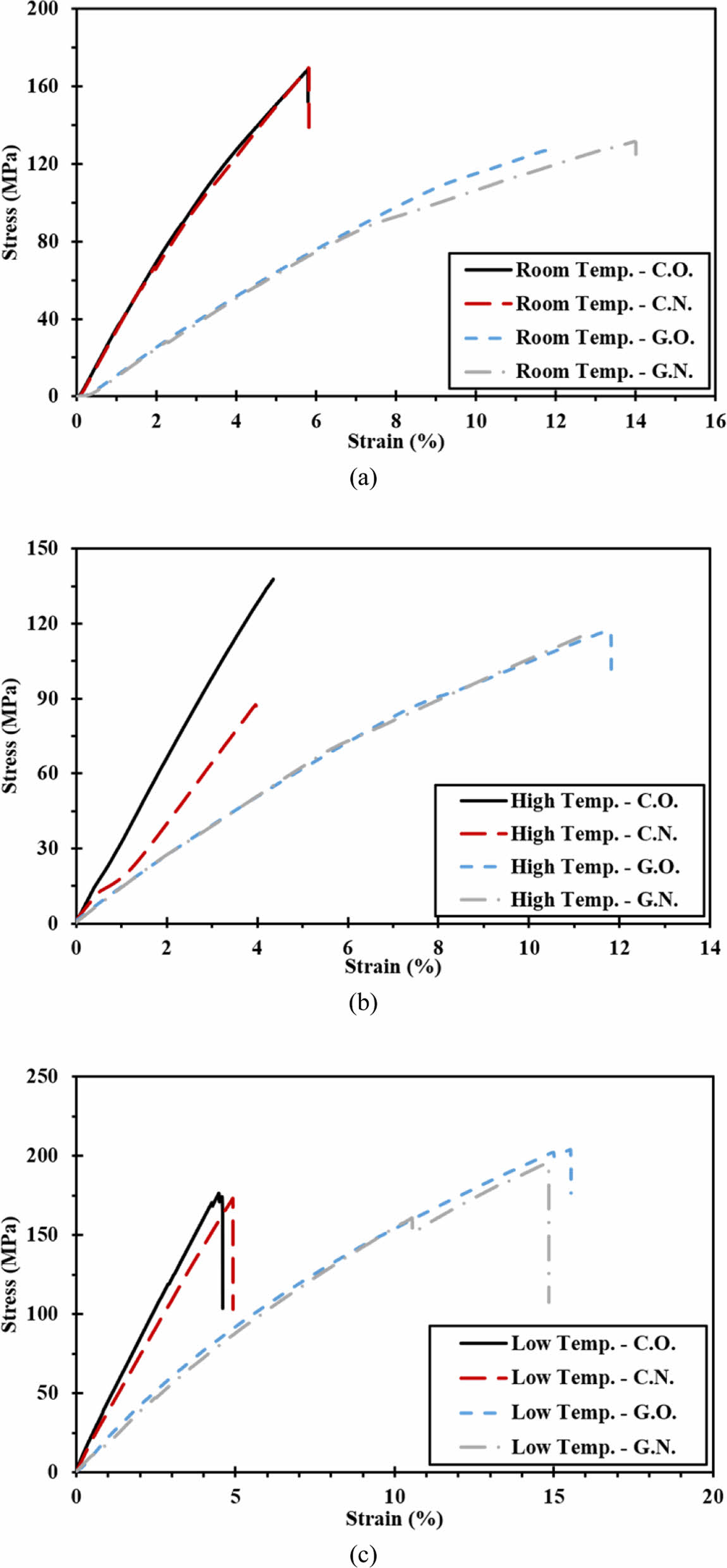 Fig. 4 Stress-Strain Curve by temperature: (a) Room temperature, (b) High temperature, (c) Low temperature |