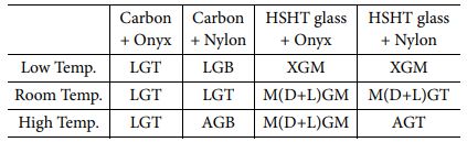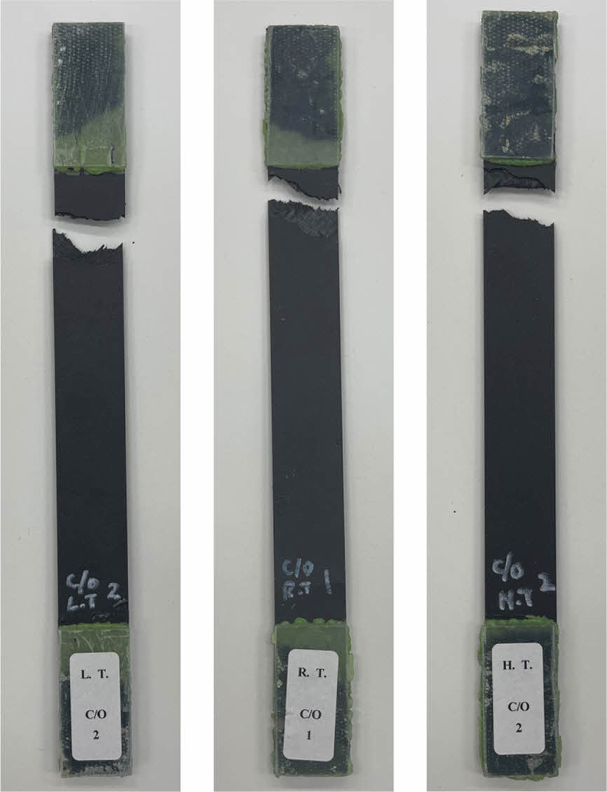 Fig. 4에서 보이는 바와 같이 저온, 상온, 고온 환경 모두에서 카본 복합재료가 고강도고온 유리섬유 복합재료에 비해 우수한 강도와 강성을 보이는 것을 확인하였다. 특히, 고온 환경의 경우 카본/나일론 복합재료는 카본/오닉스 복합재료에 비해 낮은 강도 및 강성 값을 보여주는데, 이는 탄소섬유와 나일론간 계면 결합력이 낮아 나일론에서 탄소섬유가 이탈된 것으로 판단된다[16]. 저온 환경의 경우 고온 환경과 달리 상온 환경에서의 시험 결과와 유사한 경향을 보임으로써, 저온 환경에서는 3D 프린트 복합재료 시편의 계면 결합력은 큰 변화가 없는 것으로 판단된다.