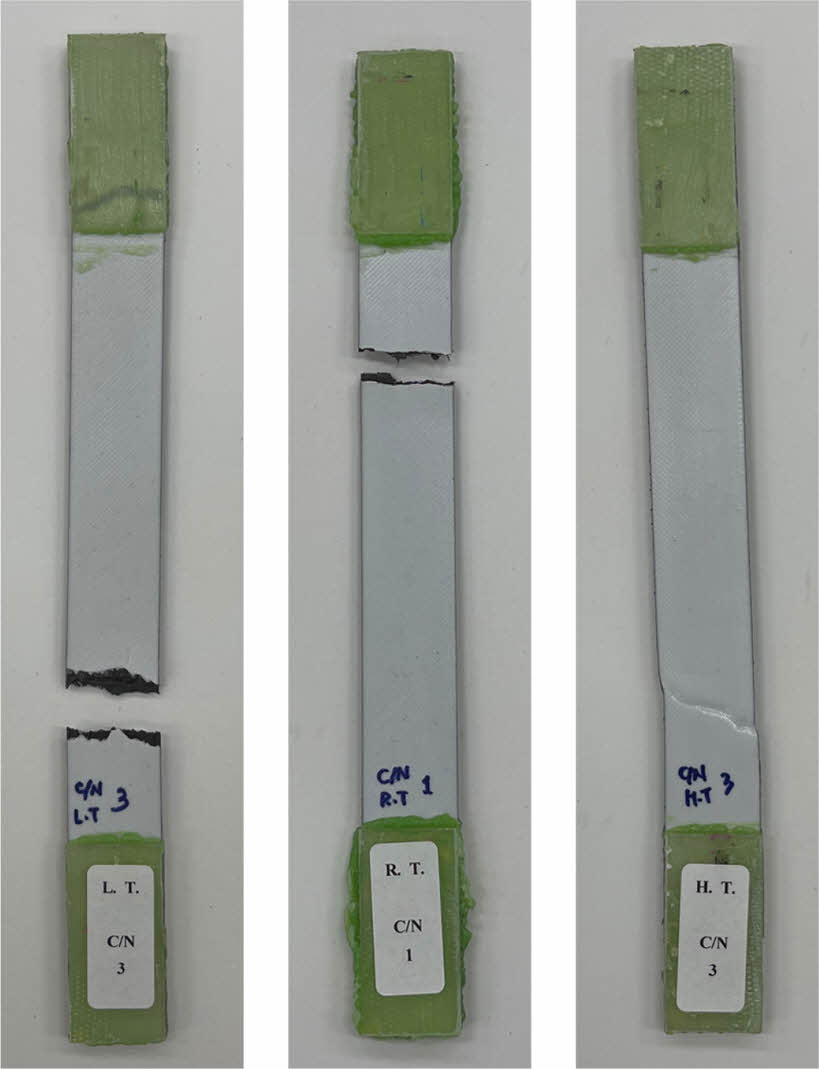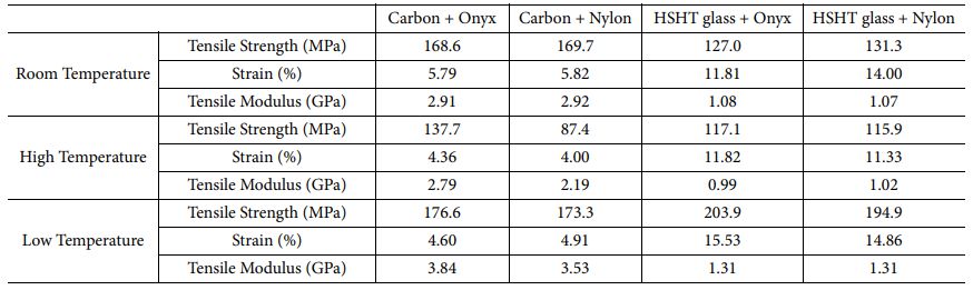 Table 2에 인장강도, 변형률과 탄성계수에 대한 결과값을 각각의 온도 환경에 따라 정리하였다. Fig. 3에서 보이는 바와 같이 모든 복합재료 시편에 대해 상온과 비교하였을 때, 고온 환경에서 인장강도가 감소함을 확인하였다. 그리고, 저온 환경에서 인장 시험 결과는 상온과 비교하여 인장강도가 증가하는 경향을 보였다. 탄소 섬유/오닉스 복합재료의 인장강도 경우 상온 대비 저온 환경에서 인장강도가 4.76% 증가하였으며 고온 환경에서 18.34% 감소하였다. 탄소 섬유/나일론 복합재료의 인장강도는 상온 대비 저온 환경에서 2.15% 증가하였고 고온 환경에서 48.51% 감소하였다. 고강도고온 유리섬유/오닉스 복합재료의 경우 인장강도가 상온 대비 저온 환경에서 60.51% 증가하였으며 고온 환경에서 7.82% 감소하였다. 또한, 고강도고온 유리섬유/나일론의 경우 인장강도가 상온 대비 저온 환경에서 48.44% 증가하였고 고온 환경에서 11.72% 감소하였다. 일반적으로 고온 환경의 인장 시험에서 섬유/오닉스 시편보다 섬유/나일론 시편이 낮은 인장강도 값을 보이는 것을 확인하였다. 이는 나일론의 열변형온도(41oC)가 오닉스의 열변형온도(145oC)보다 낮아 나일론의 변형이 빠르게 시작되어 인장강도가 저하되는 것으로 판단된다[15]. 그리고, 각 복합재료의 강성의 경우 강도와 유사하게 상온 대비 고온에서는 감소하고, 저온에서 증가하는 경향을 보였다.