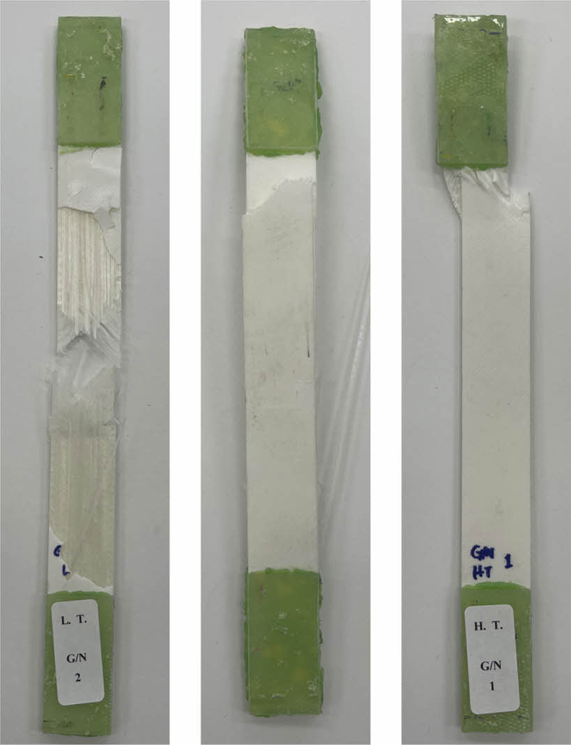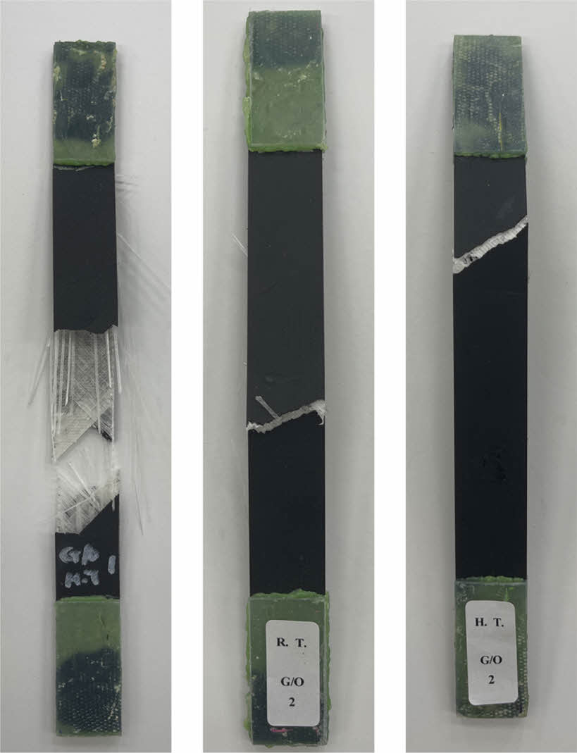ASTM D3039에서는 파손 형상을 Table 3-5와 같이 규정하였다. Table 3-5에 근거하여 분석한 파손 형상을 Table 6에 정리하였다. Fig. 4-7은 각 시편의 저온, 상온, 고온 환경에서의 인장 시험 결과를 통해 분석한 파손 형상을 나타낸다. 탄소섬유 시편의 경우 저온과 상온 환경에서 Lateral failure type의 파손 형상을 보였다. 고온 환경에서의 파손 형상의 경우 C.O. 시편은 저온 및 상온 환경에서의 파손 형상과 유사하였으나 C.N. 시편의 경우 Angled failure type이 나타났다. 고강도고온 유리섬유 시편의 failure type의 경우 저온 환경에서 eXplosive가 나타났으며 상온 환경에서는 Multi-mode(Edge Delamination + Lateral)가 나타났다. 고온 환경의 경우, G.O. 시편에서는 상온 환경과 동일한 파손 형상을 보였으나 G.N. 시편의 경우 Angled failure type이 관찰되었다. 기본 복합재료 중 나일론이 포함된 시편의 경우 오닉스가 포함된 시편과 다른 파손 형상이 나타났다. 이는 나일론의 열변형온도가 오닉스에 비해 낮기 때문에 발생한 것으로 판단된다[15]. Table 4 Fig. 5 Fig. 6 Fig. 8
