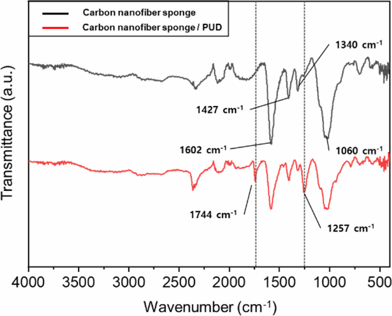 Fig. 1 FT-IR spectra of carbon nanofiber sponges without (top) and with (bottom) the PUD treatment |