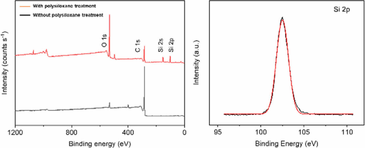 폴리실록산(polysiloxane)이 처리된 것을 확인하기 위해서 X-선 광전자분광 분석 비교를 진행했고, 데이터에서 Si 피크 발현을 통해 실록산이 전구체에 결합된 것을 확인할 수 있었다(Fig. 2).