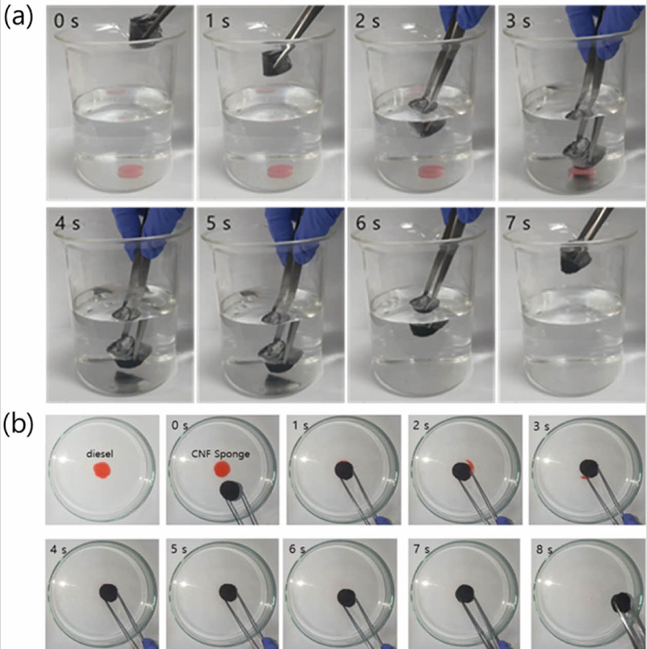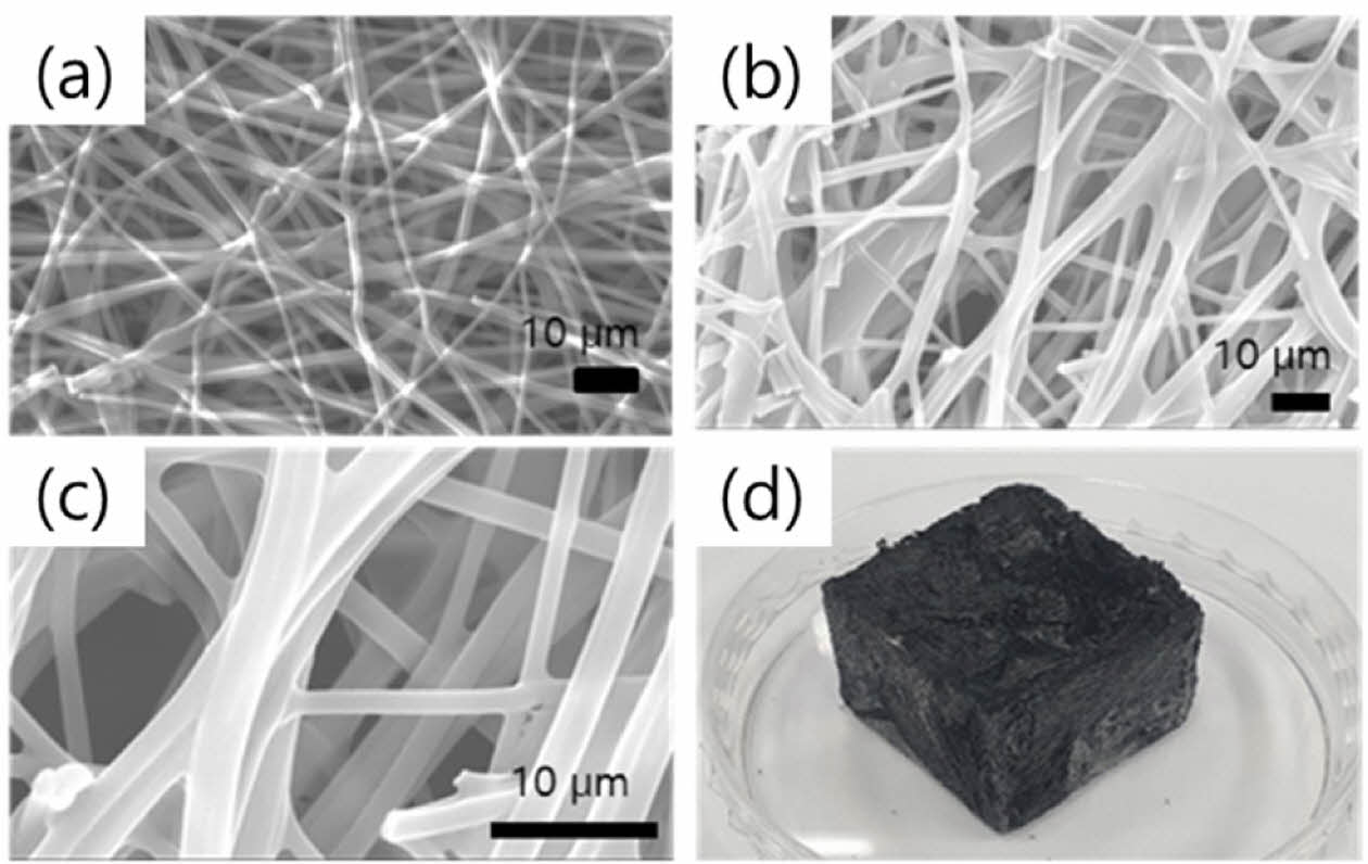 전기방사는 고분자 용액으로부터 연속 섬유를 제조하는 단순하고 다용도 적인 기술로써 주목할 만한 관심을 받아왔다. 전기방사 섬유는 높은 비표면적, 초미세 직경 및 높은 기공도 등의 고유한 특성을 갖는다[6]. 전기방사와 동결건조 기술이 결합하면 2차원 전기방사 막 구조의 3차원(3D) 다공성 스펀지 구조로 쉽게 전환할 수 있다. 제조된 3D 탄소나노섬유 스펀지는 밀도가 낮고, 공극률이 높아 유기체에 대한 젖음성이 높다는 특징을 가진다[7]. 그러나 탄소나노섬유 스펀지는 비재생 석유 자원으로부터 얻은 합성 중합체로 구성되어 있다.