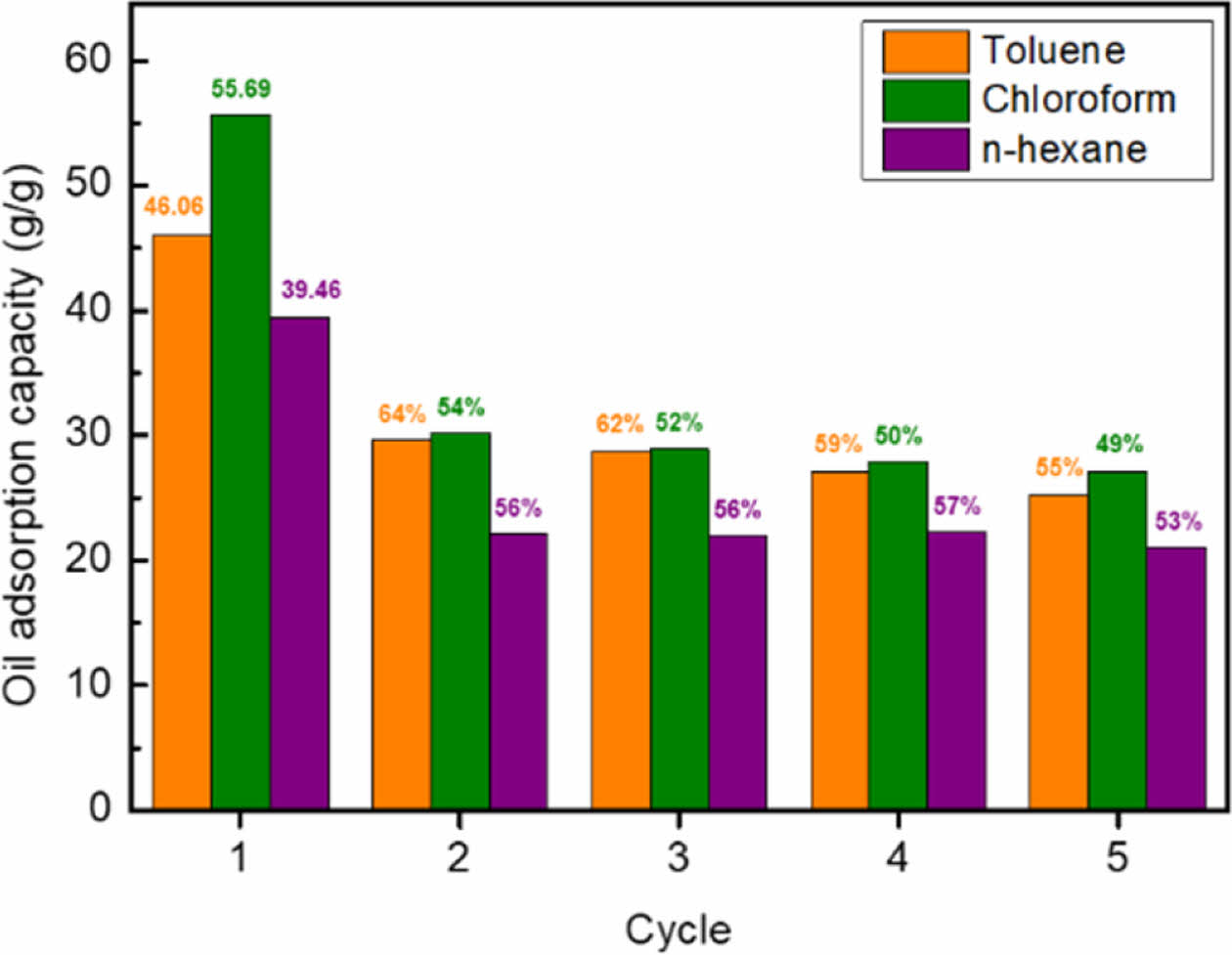 탄소나노섬유 스펀지의 1회 흡착 용량은 톨루엔에서 46.04 g/g의 흡착용량을 나타내었고, 고비중 클로로포름의 경우 최대 흡착 용량인 55.69 g/g을 나타내었으며 저비중 노말헥산에서 최소 흡착 용량인 39.46 g/g을 나타내었다. 기름 흡착 용량은 유기 화학 물질의 밀도와 관련된 관계를 직접적으로 보여주었다. 또, 흡착 후 탄소나노섬유 스펀지를 130oC에서 24시간 건조 후 동일한 조건에서 5회 반복 흡착 한 결과 클로로포름 기준으로 2회는 흡착 용량이 1회 흡착 용량에 비해 30.21 g/g(54%)으로 감소하였지만, 그 후 흡착 용량이 일정하게 유지되었으며 이는 탄소나노섬유 스펀지의 흡착 효과가 후속 테스트에서 현저하게 변하지 않음을 나타내었다(Fig. 5).