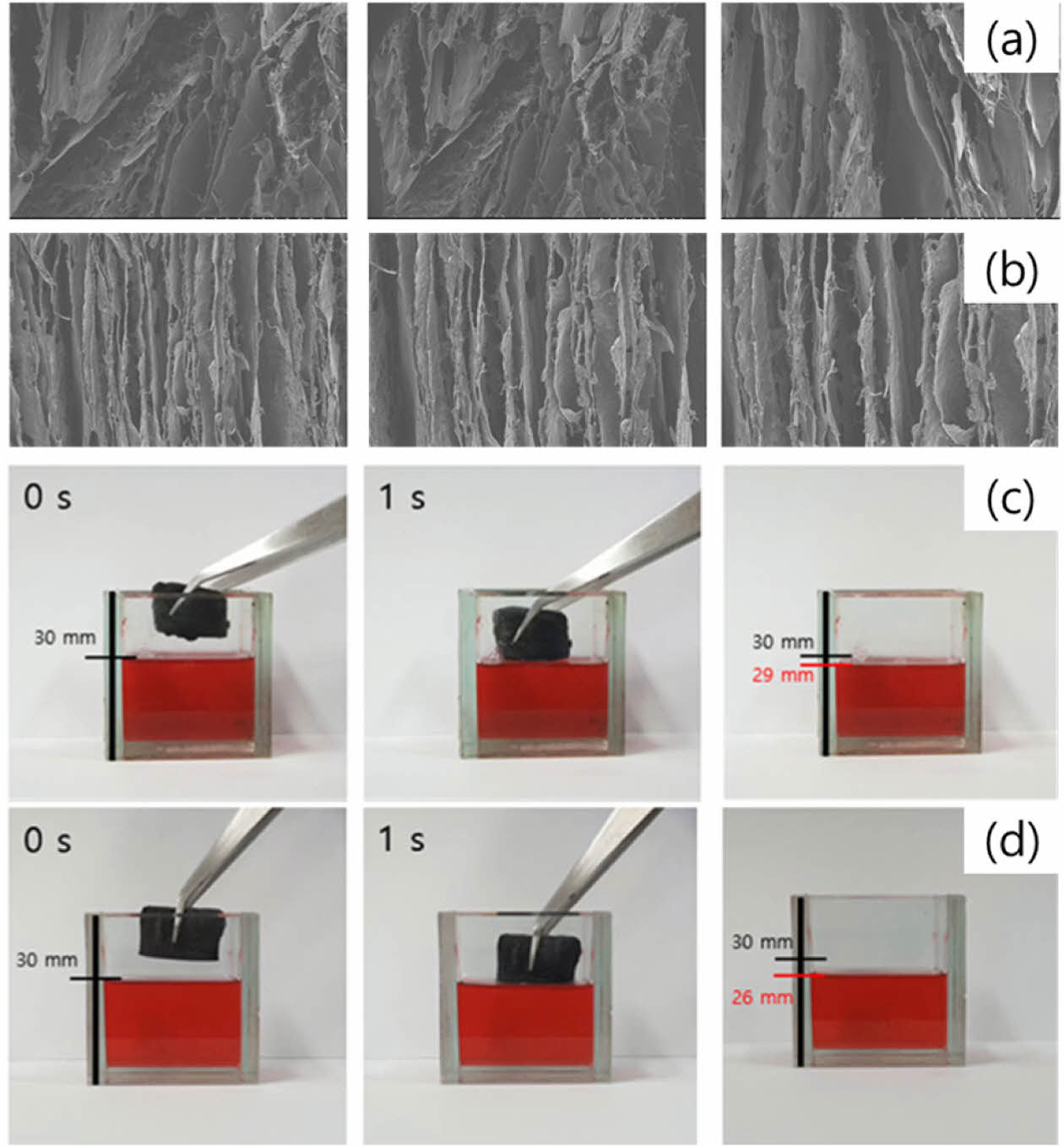 탄소나노섬유 스펀지를 제작하는 예비동결 과정에서 온도구배에 따른 얼음결정 성장 방향에 따라 결정되는 랜덤한 구조와 정렬된 채널을 볼 수 있다(Fig. 6(a-b)). 정렬된 채널이 형성된 탄소나노섬유 스펀지와 랜덤 구조를 갖는 탄소나노섬유 스펀지의 흡착 속도를 가시적으로 평가하기 위해 Oil Red O로 염색된 클로로포름 40 mL를 사각 유리 수조에 담아 그 결과를 평가하였다. 40 mL가 담긴 유리 수조에서 클로로포름의 높이는 30 mm이다. 탄소나노섬유 스펀지를 1초 동안 침지 후 제거하여 플라스크에 남은 클로로포름의 용량을 측정하였다. 그 결과 클로로포름 흡착 후 남은 용액의 높이는 랜덤 구조를 갖는 탄소나노섬유 스펀지에서 29 mm를 확인하였고, 정렬된 채널을 가진 탄소나노섬유 스펀지에서 26 mm를 가시적으로 확인할 수 있었다. 흡착제 내부 기공구조의 채널이 정렬된 경우, 내부 굴곡률이 감소하여 모세관 현상 강화를 통해 빠른 기름 흡착이 가능했다(Fig. 6(c-d)).