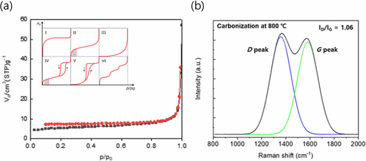 Fig. 7 (a) Nitrogen adsorption and desorption isotherms and (b) Raman spectrum of the carbon nanofiber sponge (C800) carbonized at 800oC |