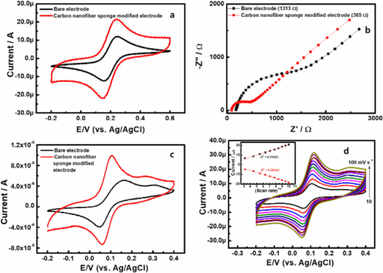 Fig. 8 (a) CVs and (b) EIS response of the bare electrode and carbon nanofiber sponge modified electrode in presence of 1 mM[Fe(CN)6] 3-/4- as redox probe in 0.1 M KCl. (c) CVs recorded at scan rate of 10 mV s-1 in the potential window between -0.2 to 0.4 V in presence of 100 μM of 4- aminophenol (phosphate buffer solution ~ pH 7.0). (d) CVs obtained at different scan rates from 10-100 mV s-1 at the carbon nanofiber sponge modified electrode in 100 μM of 4-aminophenol |