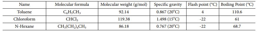 오일 흡착 특성은 탄소나노섬유 스펀지를 톨루엔, 클로로포름 그리고 노말헥산에 1분간 침지하여 무게 변화를 통해 흡착 능력을 측정하였고, 재사용성을 확인하기 위해 130oC에서 24시간 건조 후 5회 반복 실험을 하였다. 톨루엔, 클로로포름과 노말헥산의 화학적 정보는 Table 1에 확인할 수 있다.