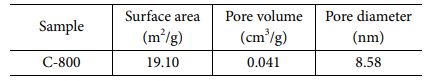 C-800의 흑연화도 특성을 알아보기 위해 라만 측정을 한 결과, 특징적인 피크인 D 피크(1360 cm‑1)와 G 피크(1560 cm-1)가 관찰되었다(Fig. 7(b)). 여기서 D 피크는 포논에 의한 비탄성 산란과 흑연 구조의 결함을 알 수 있고, G 피크는 규칙적인 흑연의 내부에 존재하는 sp2 신축에 의해 나타난다. 여기서 D 피크와 G 피크의 강도 비율(R=ID/IG)은 sp2 구조의 유지 정도와 미세 결함 정도를 나타내며 R 값이 클수록 높은 결함 정도를 나타냈다[12]. C-800의 R 값은 1.06임을 알 수 있었다.