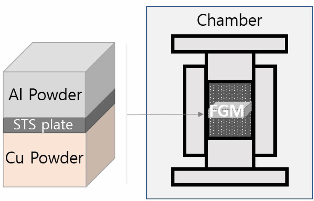 10 × 10 mm 탄소 몰드 내에 평균 입자크기 약 45 mm의 구형의 Al과 Cu 분말 사이에 0.1 mm 두께의 STS 박판을 삽입하여 Fig. 1의 모식도와 같이 챔버 내에 장입하고 방전플라즈마소결기(SPS321LX, Fuji Electronic Industrial Co. Ltd., Japan)를 이용하여 6 Pa의 진공에서 소결 온도 600oC, 가압력 250 MPa, 유지시간 5분, 승온속도 100oC/min의 조건으로 FGM을 제조하였다.
