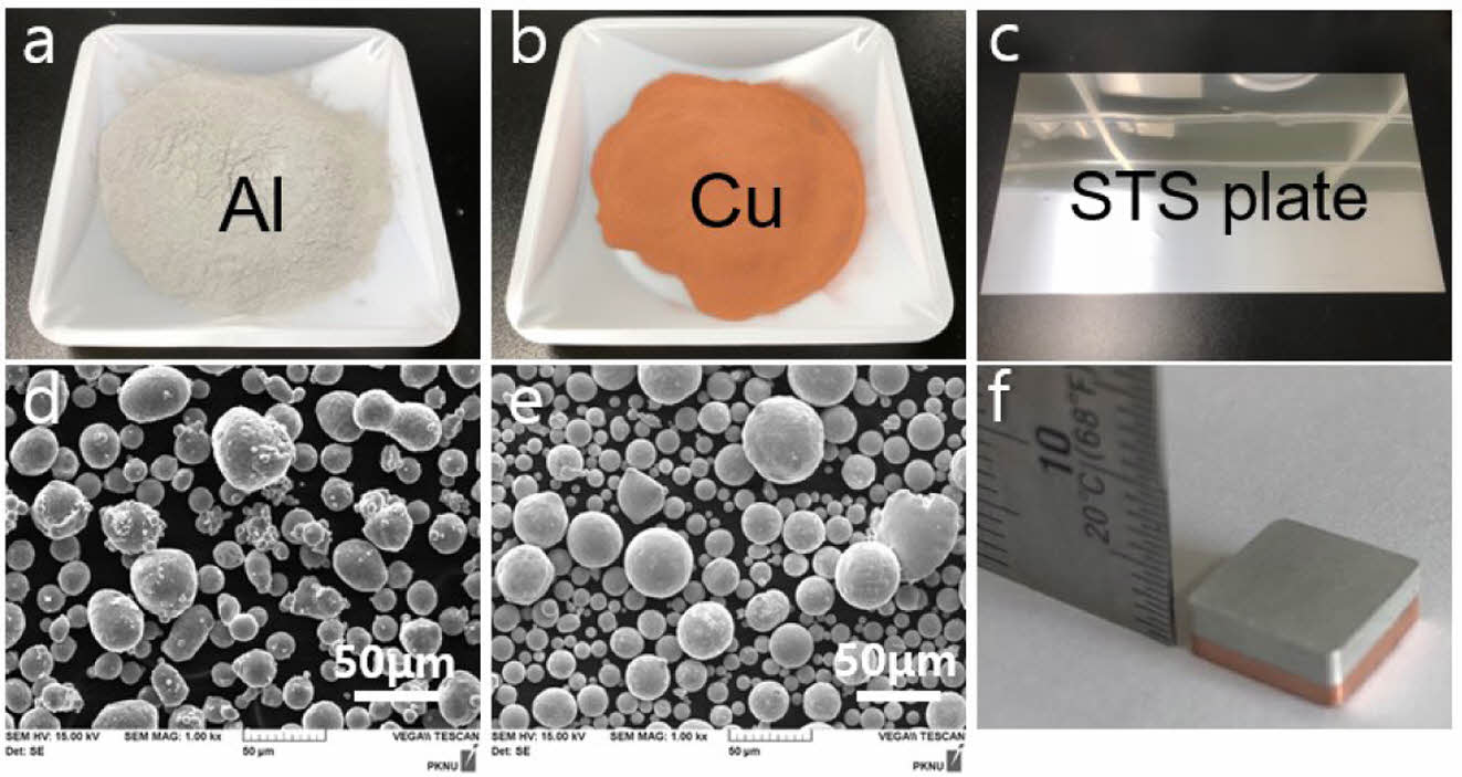 Fig. 2는 본 연구에 사용된 (a and d) Al 분말 및 (b and e) Cu 분말의 광학 및 SEM 이미지이며 (c)는 STS 박판의 광학 사진이다.