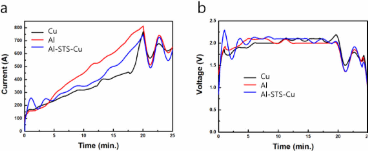 SPS 소결시 전류·전압의 거동은 각 소재가 가지는 전기적 물성값에 따라 거동이 다르게 나타날 수 있다. Fig. 3(a and b)에서 알 수 있듯이 Cu 단일 소재의 전류·전압치의 거동은 Al-STS-Cu FGM과 Al 단일 소재의 경우와 비교해 볼 때 Cu의 전류·전압치가 낮은 것을 알 수 있는데 이는 Cu의 높은 전기전도도로 인한 통전량에 차이에 의한 것으로 판단된다.