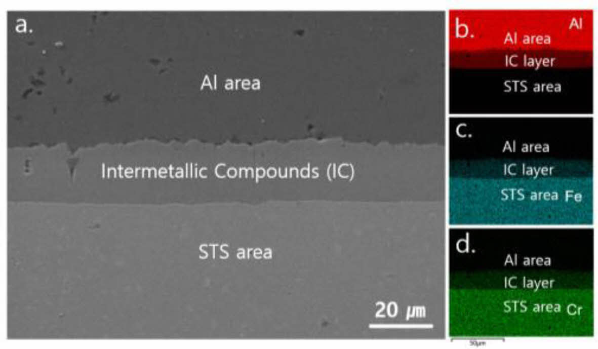 Fig. 4는 FGM의 미세조직 및 이종소재간 계면 성분 분석의 SEM 및 EDS mapping 결과이다. 특이하게도 Al과 STS 사이에서 Al, Fe, Cr 성분이 모두 검출이 되었는데 이는 금속간 화합물(Intermetallic Compounds: IC) 층의 생성에 의한 것으로 판단된다.