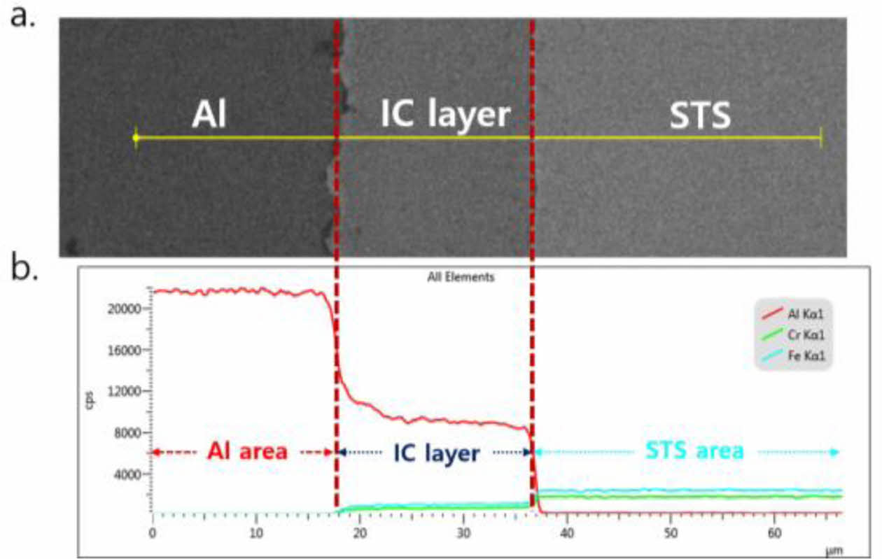 일반적으로 IC층은 SPS 공정 중 방전 플라즈마 효과에 의해 Al과 STS의 주성분인 Fe와 단시간에 반응하여 AlFe3, Al13Fe4와 같은 IC가 생성될 수 있다고 보고되어지고 있다[3,4]. 또한 Line scan 결과에서도 알 수 있듯이 계면에 IC층이 존재한다는 것을 명확하게 관찰할 수 있었다(Fig. 5).