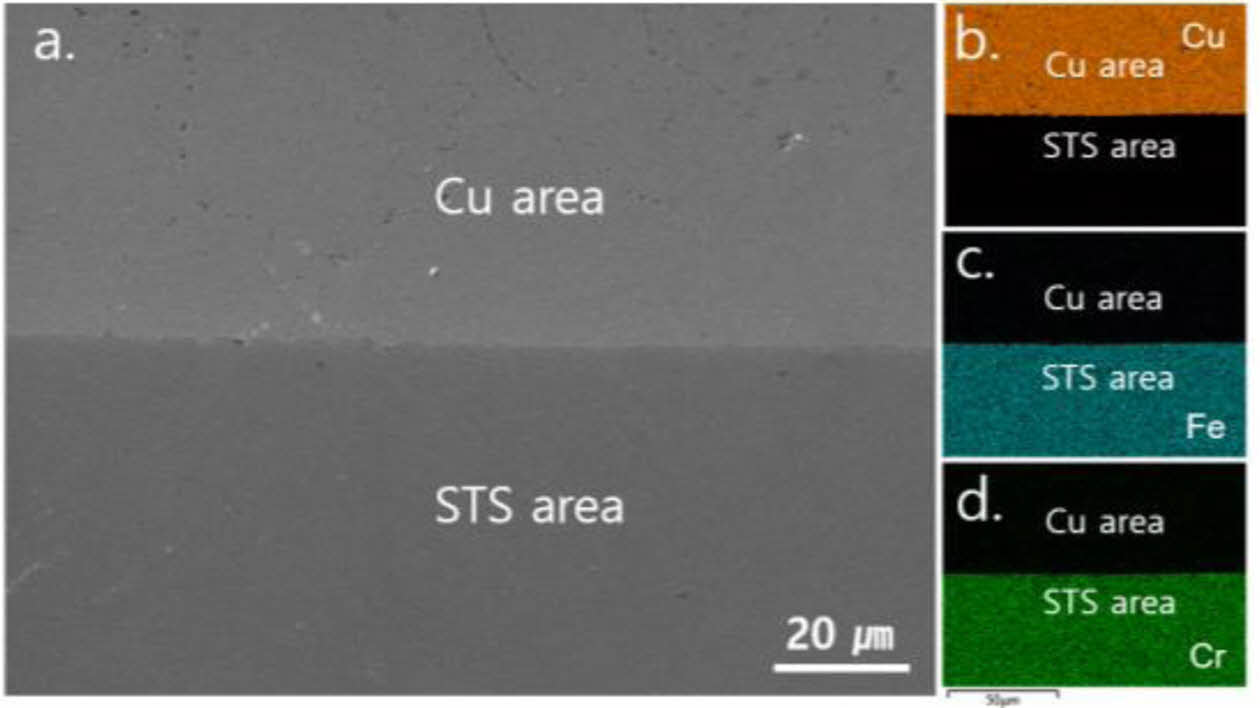 Fig. 6 Secondary electron image between (a) the Cu and STS areas and the elemental mapping of (a) for (b) Cu, (c) Fe, and (d) Cr |