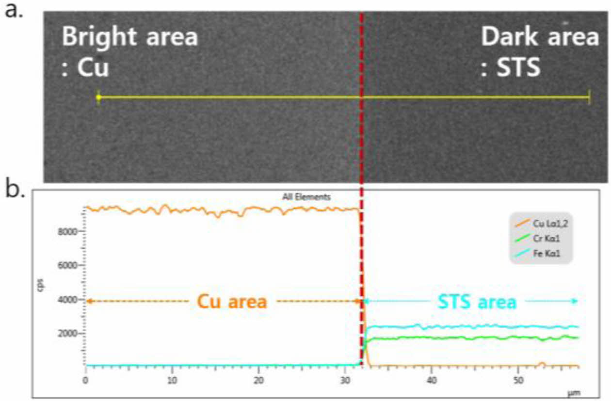 일반적으로 금속간 화합물은 취성적 성질로 인해 재료에 부적절한 영향을 미칠 수도 있지만, 적절한 미량의 금속간 화합물은 이종 소재의 계면 간에 강한 화학적 결합을 형성하여 응력을 효율적으로 전달할 수 있어 경우에 따라서는 강화재로 사용이 될 수 있는 것으로 보고되고 있다[5]. 본 연구에서 관찰된 Al과 STS 사이에 생성된 IC층 역시 Al과 STS 계면 간에 강한 화학적 결합을 유도 형성할 수 있기에 효율적 응력 전달 효과에 의한 우수한 기계적 물성과 열전도성을 지닐 수 있을 것으로 예측된다. Cu-STS 표면의 경우에는 Al-STS 사이에서 확인된 것과 같은 어떠한 성분의 IC층도 관찰되지 않았다. 일반적으로 STS의 주성분인 Fe는 Fe-Cu 상태도에서 두 물질간 생성되는 금속간 화합물이 존재하지 않기 때문에 본 연구에서도 Cu와 STS 사이에는 IC층이 없는 순수한 Cu와 STS 계면이 접합 소결된 것을 알 수 있었다.