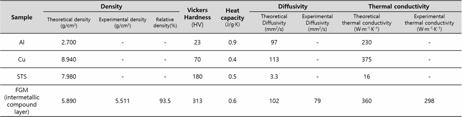 FGM의 열전도도 값은 순수 Cu 보다는 다소 낮게 측정이 되었지만 Al과 STS소재 대비 약 0.3배와 19배 증가한 것을 알 수 있다. 이러한 결과는 FGM을 구성하는 각 소재들이 기공이 없는 우수한 계면 결합력을 지니고 있다는 의미이며 이는 Fig. 4-7의 SEM 이미지에서도 확인할 수 있었다. 무엇보다도 FGM의 열전도도 값이 단일 Al과 STS소재 대비 높게 측정된 것은 Cu의 높은 열전도성이 강화재로서 효과를 낼 수 있었던 것으로 생각된다. 이는 FGM을 구성하는 물질들의 성분 함량 조정만으로도 다양한 특성의 구현이 가능하다는 것을 의미한다. 예를 들어 FGM에서 Al 첨가 함량을 높이게 되면 경량성 확보가 용이 하며 STS 첨가량을 증가시키면 고강도 특성을 확보할 수 있을 것이다. 또한 Cu 함량의 비율 조절에 따라 전도 특성을 증가시킬 수도 있을 것이다. 이러한 점으로 볼 때 FGM은 구성하는 소재 조성의 구성만으로도 본 연구에서 제안한 경량 고강도 고방열 특성의 기능 맞춤형 소재 구현이 가능하다는 것을 시사한다. Fig. 6 Fig. 8 Fig. 9