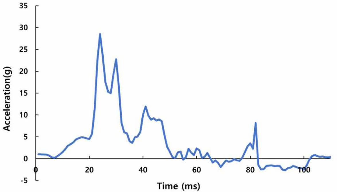 저속 후방 추돌 해석을 위한 인체모형 모델로는 Hybrid III 50th percentile male dummy가 적용되었다. 최적화 수행 시 소요되는 해석 시간 단축을 위해 Fig. 1과 같이 Neck angle bracket에서 머리 까지만 최적화 해석에 적용되었다. 적용된 가속도는 휠체어 모델에 full model dummy가 탑승한 상태에서 FMVSS 202a dynamic testing corridor[10]를 만족하는 펄스가 가해졌을 때 Neck angle bracket에서 기록된 가속도를 적용하였으며 Fig. 2와 같다.