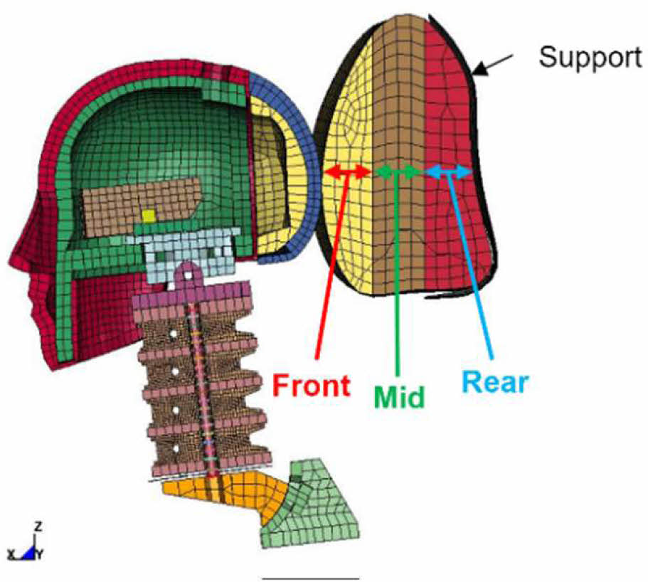 Multi-layer headrest의 형상은 NHTSA(National Highway Traffic Safety Administration)로부터 제공된 2010 Toyota Yaris Passenger sedan의 조수석 쪽 head rest FE-model이 적용되었으며 인체 모형의 관상면 방향으로 등분되었다. 생성된 layer는 후두부와 가장 가까운 쪽부터 Front, Mid, Rear layer순으로 배치되며 이렇게 형성된 Multi-layer headrest의 FE-model은 Fig. 3과 같다.