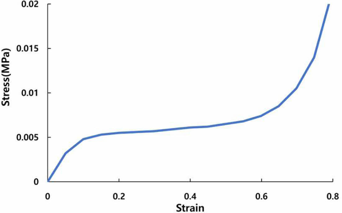 적용된 foam의 밀도는 35 kg/m3이고 Fig. 4에서와 같이 MTS 858 장비를 통해 0.01 mm/s의 속도로 35 mm까지 눌렸을 때 Fig. 5와 같은 압축 응력-변형률 곡선을 나타내었다. 본 연구에서는 해당 foam의 hard한 기계적 거동 특성을 구현하기 위해 해당 압축시험을 통해 얻은 응력-변형률 선도의 응력값이 10n(stress scale factor)만큼 확대되어 적용되었다. 여기서 stress scale factor가 100일 때는 Fig. 5를 의미하며 n이 증가할수록 기존 시편대비 상대적으로 hard한 기계적 거동을 해석을 통해 나타내게 된다.