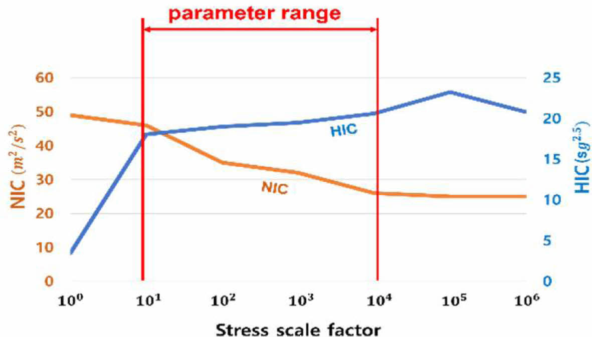Fig. 6 Tendency of HIC and NIC by stress scale factor |