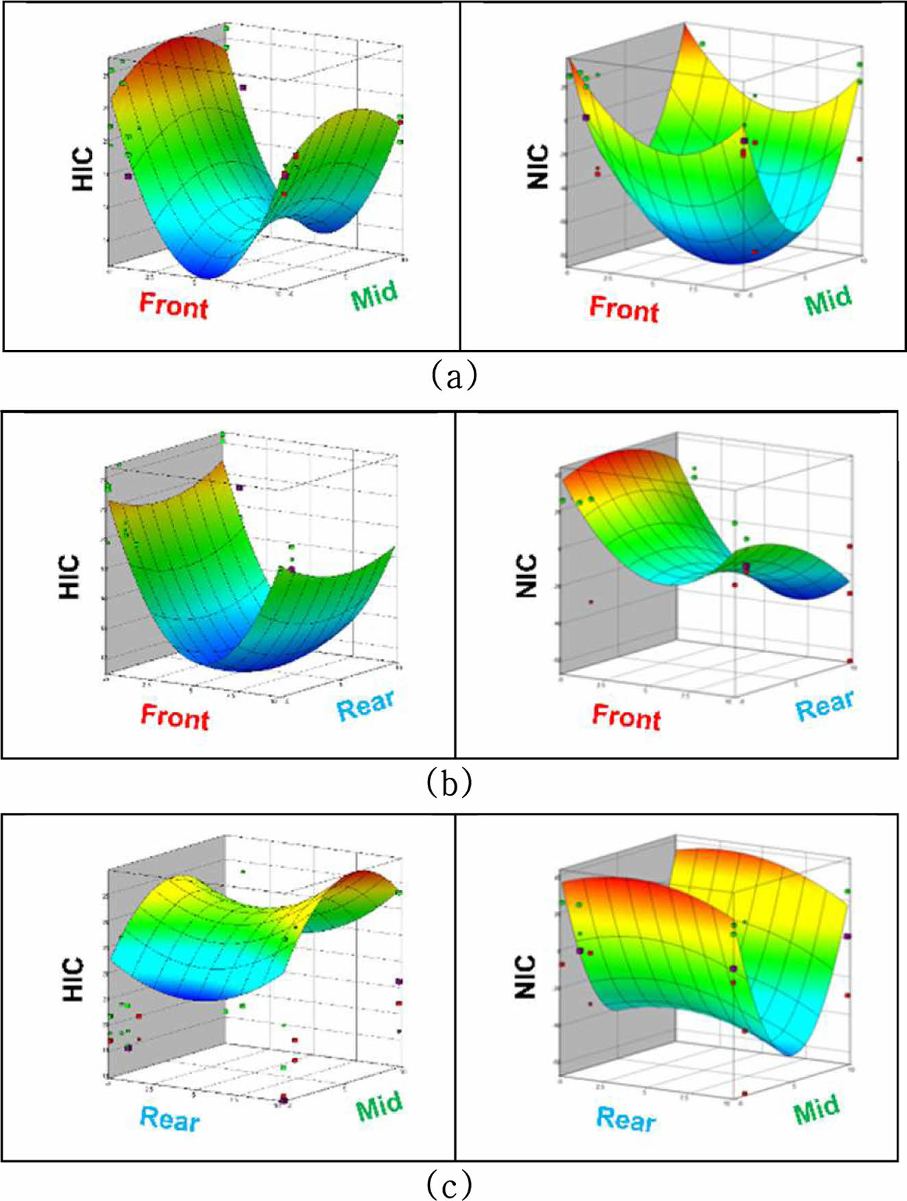 Fig. 8 Response surface according to the combination of compression characteristics: (a) Front-Mid, (b) Front-Rear, (c) Rear-Mid |