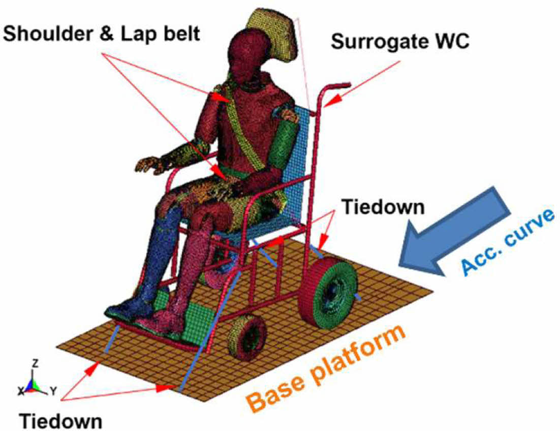 일반 headrest와 GA를 통한 layer의 최적 배치가 이루어진 Multi-layer headrest간의 비교 분석을 위해 Fig. 10과 같이 validation model에 적용을 통한 전체 해석이 수행되었고 일반 headrest에 적용된 foam의 물성은 NHTSA의 crash simulations에 이용되는 headrest의 물성치가 사용되었다. 해석은 차량내 휠체어에 탑승한 장애인의 상황을 구현하였으며, 휠체어는 WC-19[11]를 만족하는 surrogate wheelchair가 적용되었다. 실제 탑승 시 장애인과 휠체어의 구속 조건[12]에 따라서 휠체어는 플랫폼과 tie-down을 통해 구속조건이 부여되었고, 탑승자는 3점식 안전벨트로 구속하였다. 저속 후방 추돌 상황을 모사하기 위해 추돌속도 17 km/h, 최대 가속도 9.0 g, 지속시간 9 0ms를 만족하는 가속도[10]가 적용되었으며, 가속도 곡선은 Fig. 11과 같다.