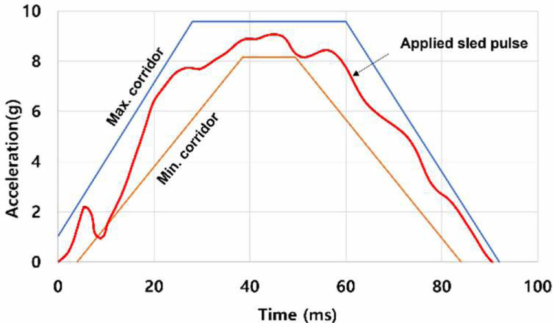 Fig. 11 Acceleration curve used for rear-end collision sled test based on FMVSS 202 dynamic testing corridor |